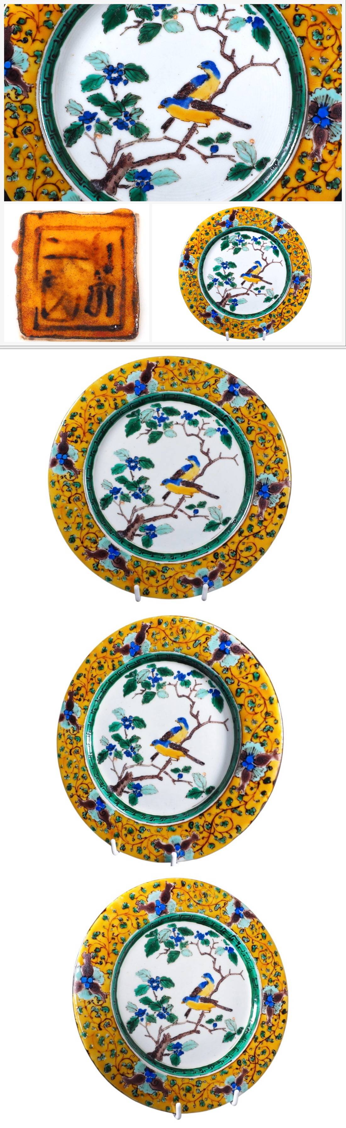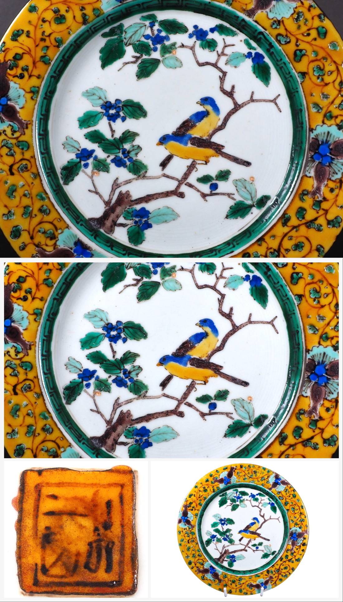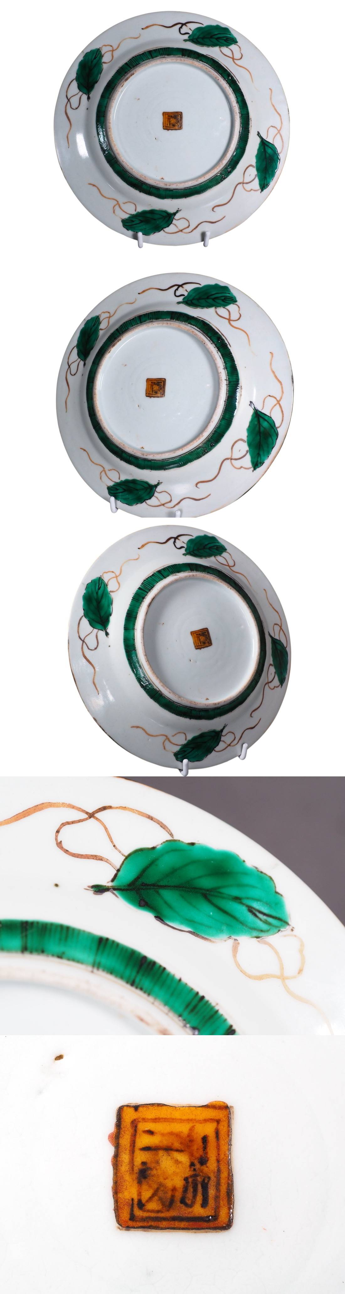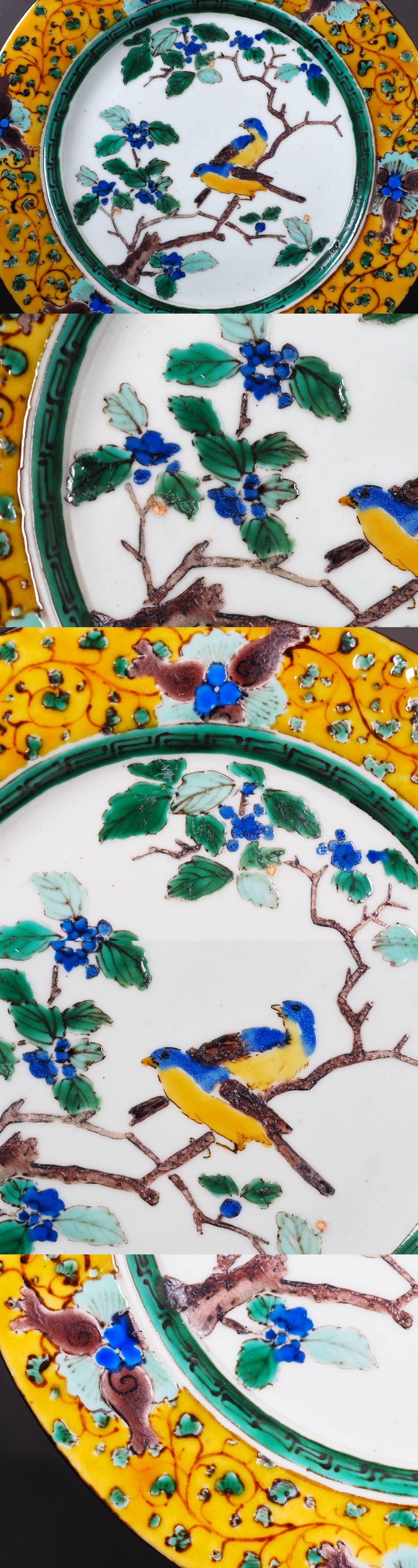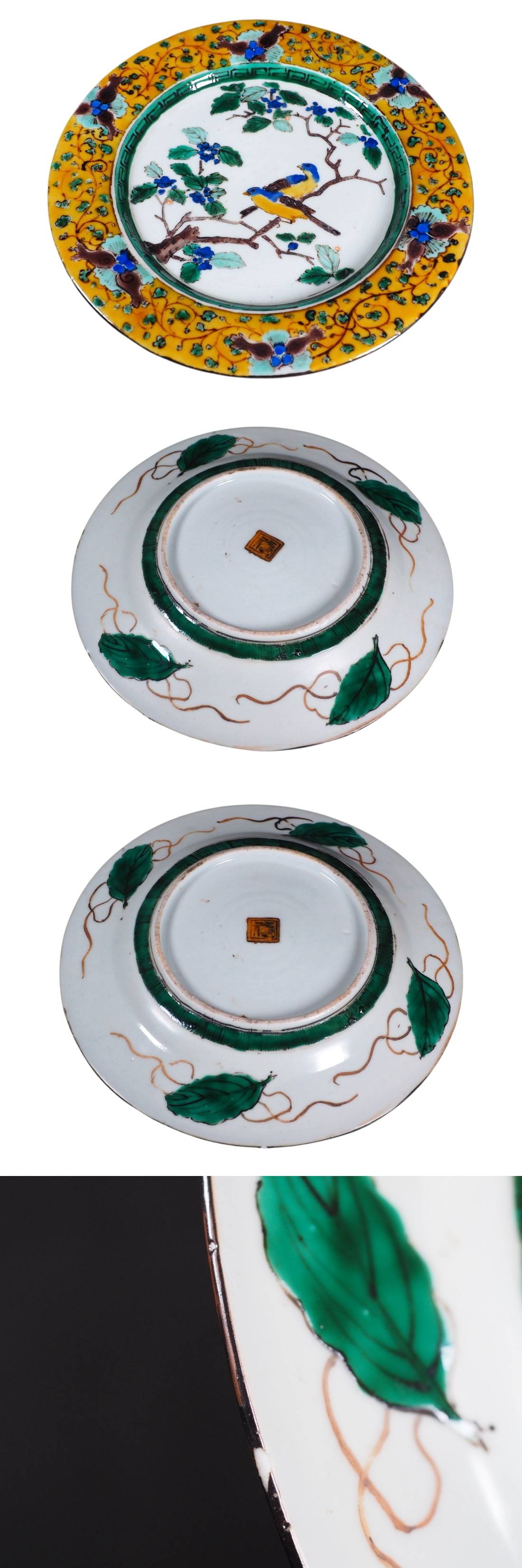 豊かな色彩と美しい筆致で描かれた青手九谷の飾り皿です。