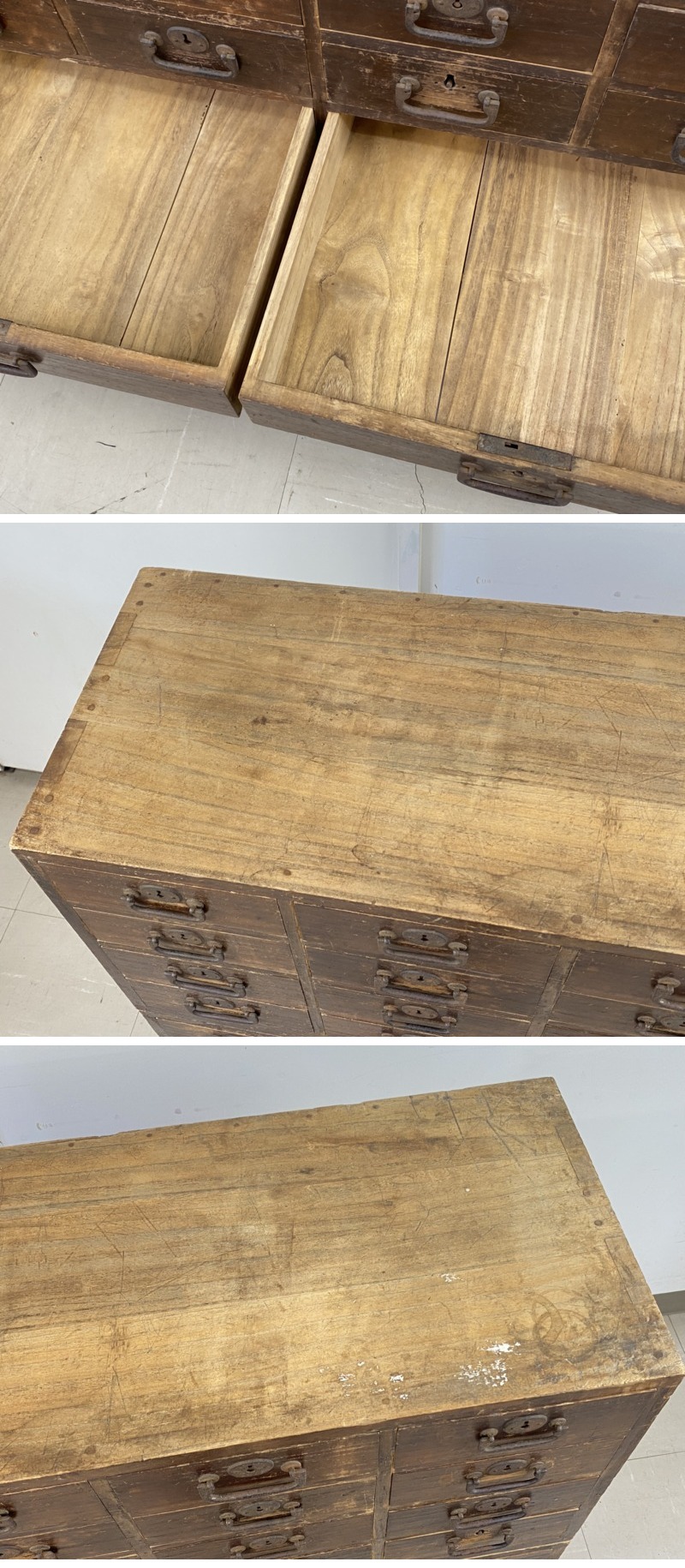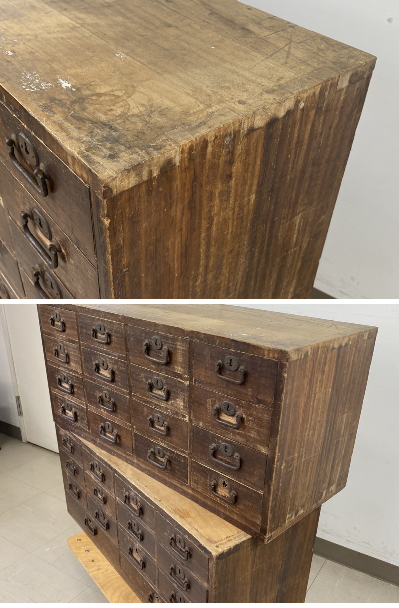 ◇商品情報◇ | 当店の商品をご覧いただきありがとうございます!! 時代箪笥 収納箪笥 整理箪笥 8段 引き出し 和箪笥 和家具 古民具 鍵付き になります。 サイズ:幅 約85cm、奥行 約31.5cm、高さ 約76cm 鍵付き。 上下分かれます。 経年相応のキズ・汚れ・サビ等ございます。また鍵穴の金具が付いていないところもございます。 引き出しの開閉は若干しぶいです。 状態などは画像を参考の上、ご検討をよろしくお願い致します。 ※撮影の都合上、台車等やサイズ感で茶碗が写っておりますが付属は致しませんので予めご了承ください。 送料元払いクロネコヤマト家財便での発送になります。 落札後直接、当社へお引取りも大歓迎です!積み込みはお手伝い致します。 ※目視チェックをしていますが、表記漏れや見落としや細かな擦れ・薄汚れなどがある場合もございますので予め画像をご確認の上でご入札をお願いいたします。 簡易動作確認済みですが中古家電品の寿命については個体差があるため不具合がございましたら到着後3日以内の故障や初期不具合のみの対応となります。 お品物が届きましたらお早めにチェックや動作の確認をお願いいたします。 ※発送時注意点※ 大型商品につき発送は個人・法人問わず、クロネコヤマト家財便で発送となります。 大きい商品になりますので離島など一部輸送できない地域もありますので心配な方は事前にクロネコヤマト家財便にお問い合わせ下さい。 ※気持ちよくお使い頂けるように簡易ですが清掃済みです。取りきれない汚れなどはご容赦下さい。 | ||||||||||||