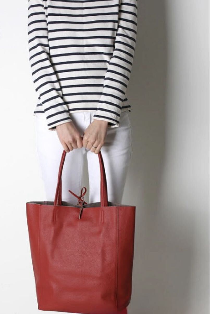 「IL FLNG イルフランジ」のトートバッグです。サイズ・・・縦約38cm、横(口部分、たたんで採寸)約40cm、マチ約13cm。素材・・・レザー。カラー…赤。定価・・・18700円。イタリア製。シボ感のある上質なイタリアンレザーを使用した、トートバッグです。しっかりと収納できるサイズ感で、底板付きで安定感もあります。数年前に購入し、何度か使用しました。使用回数は少なく、レザー自体の擦れやキズなどはほとんどないです。ただ、数か所に黒い汚れがあります(写真でご確認ください)。ご理解いただける方にお願いいたします。保存袋等はありません。よろしくお願いいたします。