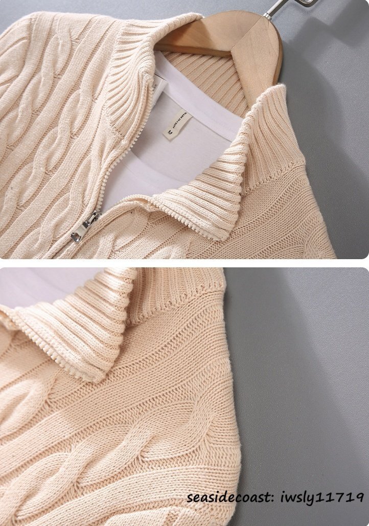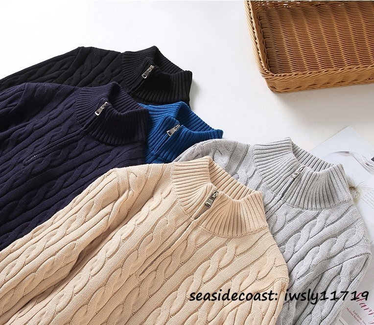 新品◆ニット セーター メンズ 厚手 無地 防寒 立ち襟 ブルゾン 麻編み プルオーバー ハーフジップ コットン 秋冬 上質 ベージュ 3XL 收藏