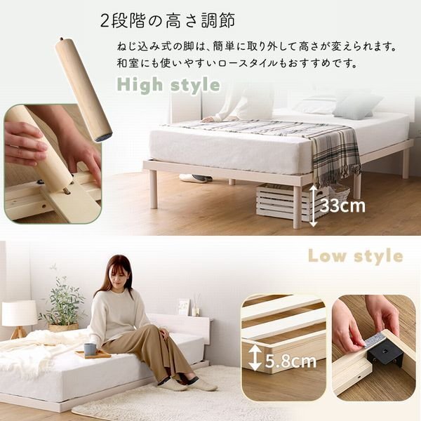 | パイン材高さ2段階調整脚付きすのこベッド(ダブル)の宮セット! 北欧産パインフレームを使用し、耐久性に優れています。 低ホルムアルデヒド仕様で、お子様でも安心してご使用いただけます。 |