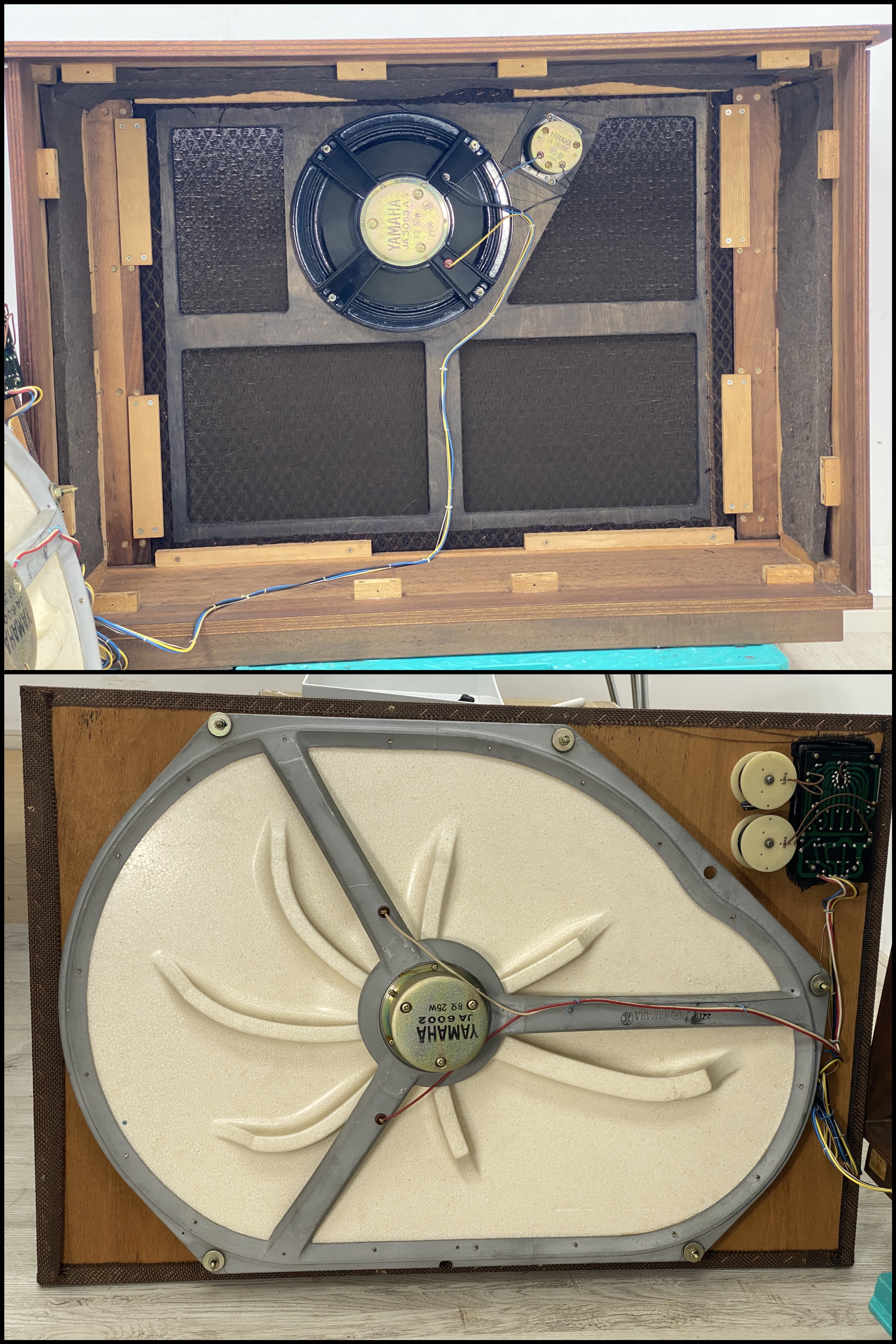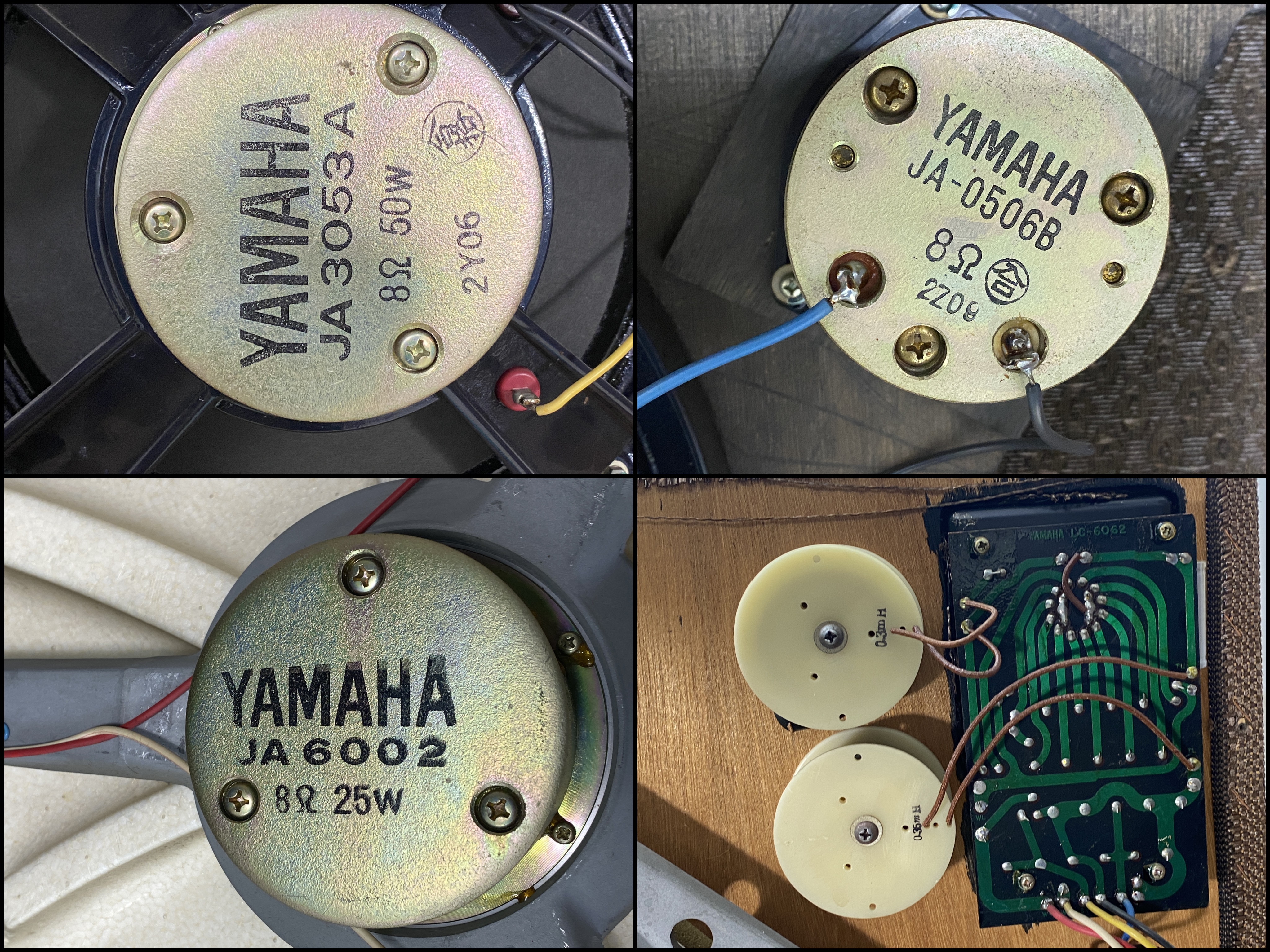 この度は弊社の出品物をご覧いただきありがとうございます! 今回こちらのお品物をご紹介させていただく『再良市場』の神谷と申します。 どうぞ最後までお読みいただければ幸いです。 こちらは YAMAHA NS-370 スピーカーペア です。 中古品となります。 まず、お品物のご紹介の前にシリアルが #2009 と #1932 がございます。 それぞれどちらの個体を撮影した物か随時記載しておりますので、そちらを念頭にご覧ください。 今回出品しますのは、1973年頃に発売された特殊大型振動板NS型ユニットを搭載したNS-370型モデル。 低域には570x820mmの大型振動板NS型ウーファーユニットのJA-6002を搭載。 特殊成型による振動板は、振動面積が大きく剛性を持ち、湿度による影響の無い耐久性の高いものに仕上げられているとされ、 ボイスコイルには66φの大口径アルミリボン線エッジワイズ巻きが採用され、 マグネットにはヤマハ合金技術によって生まれた特許・ゾーメルティング製法による超異方性マグネットYM-5Sを使用されています。 中域には30cmコーン型スコーカーのJA-3053を搭載。 大型スピーカー用に開発されたユニットで、厳選された素材を抄いて成型されたコーン紙には、 高域の減衰のためウールが配合されており、中音域の豊かな再現のため特殊な断面形状を持たせてあります。 高域にはホーン型トゥイーターのJA-0506Bを搭載。 振動板には厚さ30μの特殊硬質ジュラルミン箔が使用され、エッジはタンジェンシャルコルゲーションを持つ構造により、 強度を高めているとされ、また磁気回路には、アルミリボン線エッジワイズ巻きによる23φボイスコイル、 空隙磁束密度17,000gauss、総磁束24,600maxwellの40φマグネットを搭載し、110dBの高能率を実現しているとされています。 NSスピーカー 資料リンク 【コンディション】 コンディションや各所の拡大としましては、以下の画像も併せてご覧ください。