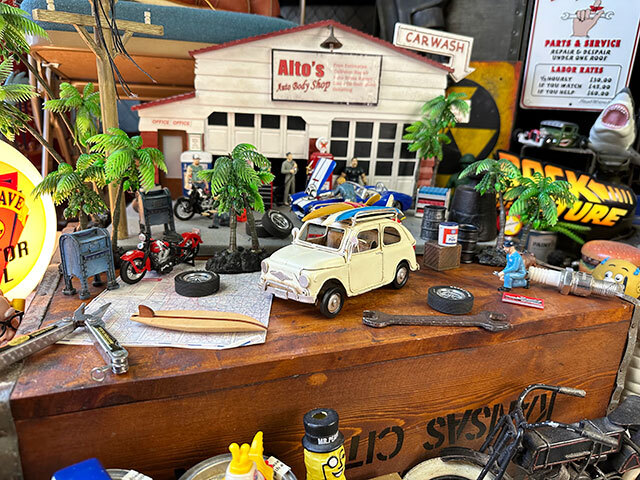今回のブリキカーはルーフキャリアにサーフボードを載っけた、「海に向かうストーリー」を連想させてくれる・・・・