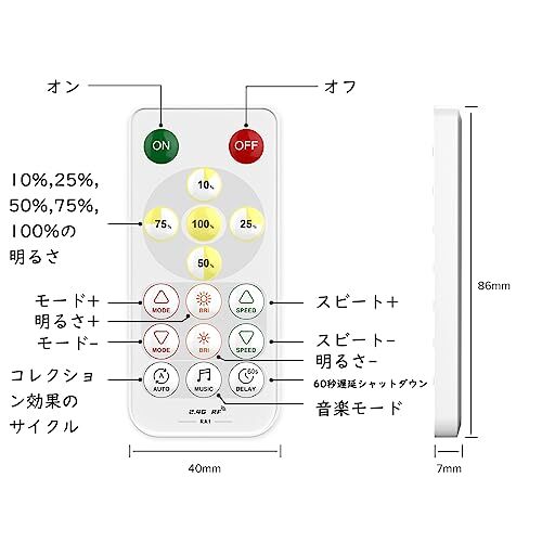 「RFリモコンは明るさを調整でき」このRFコントローラーは、小さな本体、便利な配線、シンプルでわかりやすい操作、快適なボタンを備えています。5種類の柔らかな明るさ調整モード、3種類のダイナミックモードと、2種類の音楽モードがあります。また、ダイナミックモードでは、ジャンプ、フェード、ストロボの各モードでスピード調整が可能です。コントローラは60S遅延シャットダウンの適切なシーンで使用できるため、より多様な体験をすることができます。