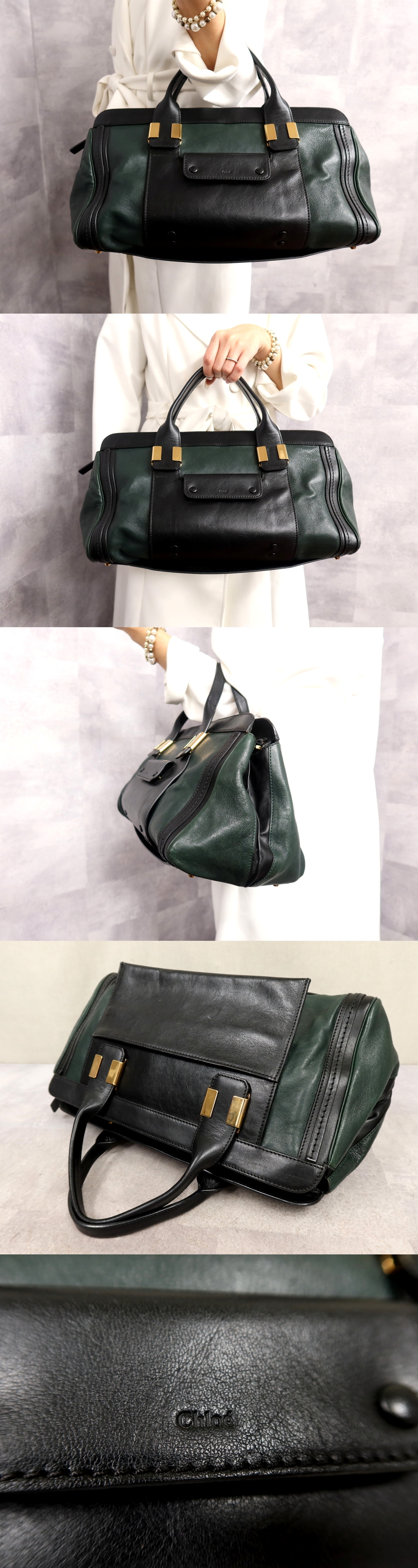 ●超美品●Chloe クロエ●アリス●バイカラー●カーフ レザー 本革●ハンド バッグ●黒 グリーン系●ゴールド金具●B5 収納 書類●Js62848 收藏