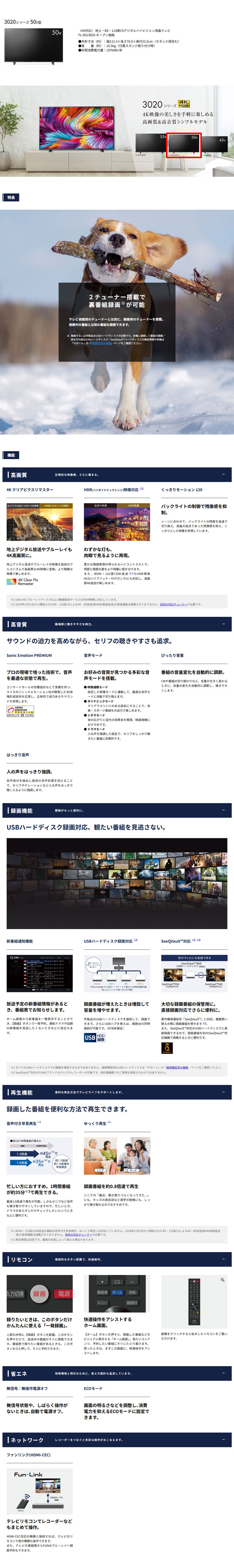 フナイ 50V型4K液晶テレビ FL-50U3020 を出品いたします。 ■特徴■ 4K映像の美しさを手軽に楽しめる、 高画質&高音質シンプルモデル。 2チューナー搭載で裏番組録画が可能 テレビ視聴用のチューナーとは別に、 録画用のチューナーを搭載。 視聴中の番組とは別の番組を録画できます。 ※録画するには市販品のUSBハードディスクが必要です。 本機に接続して番組の録画/再生が可能な USBハードディスク/SeeQVaultハードディスクの 最新情報や詳細は「サポート」の 「接続確認済み機器」ページをご確認ください。 4Kクリアピクスリマスター 地上デジタル放送やブルーレイも4K高画質に。 地上デジタル放送やブルーレイの映像を 独自のアルゴリズムで高画質な4K映像に変換。 より精緻な映像で楽しめます。 HDR(ハイダイナミックレンジ)映像対応 わずかな灯も、肉眼で見るように再現。 豊かな階調表現が得られるハイコントラストで、 明部と暗部の差をより明確に描き分けます。 また、BS4K・110度CS4K放送の HDR規格HLG(ハイブリッド・ログガンマ)にも対応し、 高画質4K放送が楽しめます。 くっきりモーション 120 バックライトの制御で残像感を抑制。 シーンに合わせて、 バックライトの明度を高速で切り換え。 液晶の弱点であった残像感を抑え、 くっきりとした映像を実現しています。 Sonic Emotion PREMIUM プロの現場で培った技術で、音声を最適な状態で再生。 コンサートホールの音響設計などで実績を持つ、 スイスのソニックエモーション社が 開発した3D音場形成技術を応用し、 立体的で迫力あるサラウンドを実現します。 音声モード お好みの音質が見つかる多彩な音声モードを搭載。 ぴったり音量 番組の音量変化を自動的に調節。 CMや番組の切り換わりなど、 音量が大きく変わるときに、 音量の変化を自動的に調節し、 聴きやすくします。 はっきり音声 人の声をはっきり強調。 音声成分を抽出し独自の音声処理を加えることで、 セリフやナレーションなど人の声を はっきり聴こえるように強調します。 新番組通知機能 放送予定の新番組情報があるとき、 番組表でお知らせします。 ホーム画面から新番組を一覧表示することができ、 【録画】ボタンで一発予約。 連続ドラマや話題の新番組を 見逃したくないときなどに役立ちます。 USBハードディスク録画対応 録画番組が増えたときは増設して容量を増やせます。 市販品のUSBハードディスクを接続して、録画できます。 さらにUSBハブを使えば、 複数台の同時接続が可能です。(8TB未保証) SeeQVault対応 大切な録画番組の保管用に。 直接録画対応でさらに便利に。 著作権保護技術「SeeQVault」に対応。 機器買い替えの際に録画番組を移せます。 また、SeeQVault対応の USBハードディスクに直接録画できるので、 録画番組を別のSeeQVault対応機器で 視聴するときに便利です。 音声付き早見再生 忙しい方におすすめ。 1時間番組が約35分で再生できる。 最高1.6倍速で再生が可能。 しかもセリフなど音声も聴き取りやすくしていますので、 忙しいとき、ドラマのあらすじだけ チェックしたいというときなどに便利です。 ゆっくり再生 録画番組を約0.8倍速で再生 シニアの「最近、聴き取りづらくなってきた...」にも、 キッズの英会話など語学の勉強にも、 しっかり聴き取れるのでおすすめです。 録りたいときは、このボタンだけ かんたんに使える「一発録画」。 上部の中央に【録画】ボタンを配置。 このボタンを押すだけで、 放送中の番組がすぐに録画できます。 番組表で録りたい番組があるときも、 このボタンをひと押しで、すぐに予約できます。 快適操作をアシストするホーム画面。 【ホーム】ボタンを押すと、 録画した番組などをビジュアル表示する「ホーム画面」。 見たいコンテンツ、 予約したい番組にすぐにたどり着けます。 困ったときは、まずこの画面に。 快適操作をアシストします。 無信号/無操作電源オフ 無信号状態や、しばらく操作が ないときは、自動で電源オフ。 ECOモード 画面の明るさなどを調整し、 消費電力を抑えるECOモードに設定できます。 ファンリンク(HDMI-CEC) テレビリモコンでレコーダーなどもまとめて操作。 HDMI-CEC対応の機器と接続すれば、 テレビのリモコンで他の機器も操作できます。 また、テレビの番組表から FUNAIブルーレイへ録画予約もできます。 ■仕様■