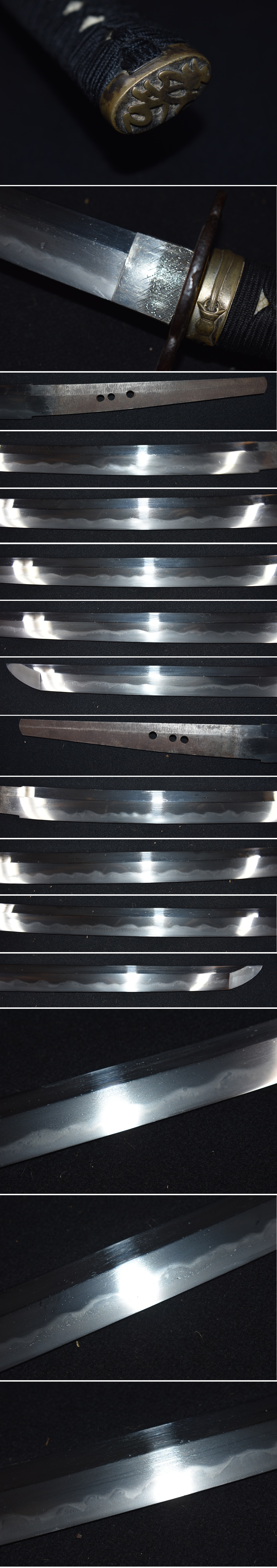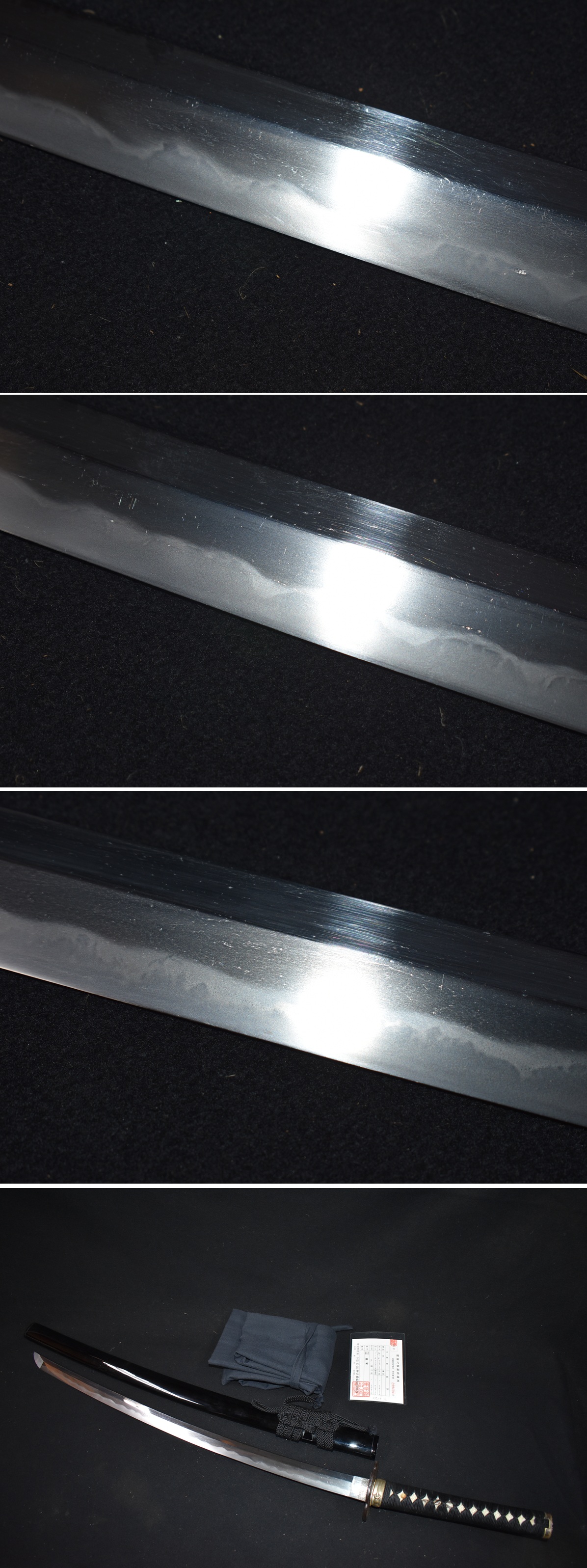 ご覧いただきありがとうございます。今回出品する品物は、写真の刀です。 銃砲刀剣類登録証番号 東京都 第299404号 種別 刀 長さ 63.6センチ 反り 1.6センチ 目くぎ穴 3個 元幅約3.2センチ 元重約0.7センチ 先幅約2.3センチ 刀身だけの重量約710グラム 在銘 無銘 拵え付きの御刀です。拵えは独鈷剣縁頭に鉄地木瓜型金象嵌の仙人図です。ハバキは銀無垢ハバキで 黒塗り鞘になっています。 鉄味のいい木瓜型鍔で、象嵌も綺麗で図柄もいい鍔です。 刀身は、互の目乱れ刃紋の鎬造りで、研ぎ済みっですので、綺麗な刀身です。錆や刃こぼれやハギレ はありません。 刀身の時代は、体配やバランスから見ると江戸時代の頃の御刀で、越後守包貞のような刀身です。 覇気のある刀身で、上研ぎ済みですので綺麗です。 二代 越後守包貞(にだい えちごのかみかねさた)は江戸時代の摂津国の刀工。後守包貞二代目。 初代越後守包貞の門人。寛文9年(1669年)頃に初代が没した際、初代の子・岩松が幼少だったた め代わりに包貞を名乗る。延宝8年(1680年)頃、包貞銘を岩松に譲り自らは坂倉言之進照包と改銘。 濤乱刃、又はその中間的特徴のある矢筈がかった大互目乱刃を得意とする大阪新刀の代表的な名工。 上々作。大業物。助廣写しの直刃も存在する。 後は写真と画像を見て判断下さい質問はわかる範囲でお答えしますので、入札前にお願いします。 発送はゆうパックの着払いです。 ※注意事項※落札しましたら、登録のある教育委員会に名義変更届を出してください。 よろしくお願いします。 |