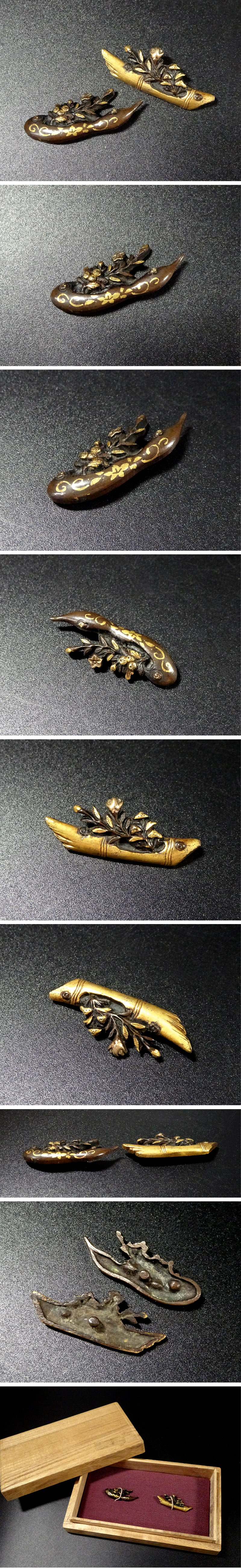 敬逢 秀逸 刀装具 花に竹瓢箪吊り花籠図目貫 無銘 赤銅地 容彫 金象嵌色絵 極上細密細工 化粧箱付き 侍 TST-43 收藏