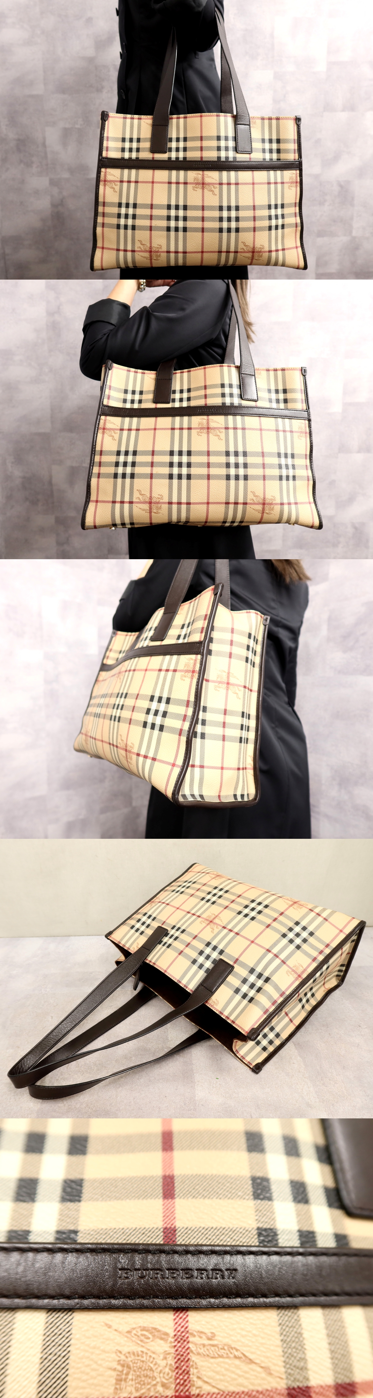 超美品●BURBERRY バーバリー●ノバチェック●ロゴ型押し●PVC カーフ レザー 本革●トート バッグ●ベージュ●ゴールド金具●A4●Js65630 收藏