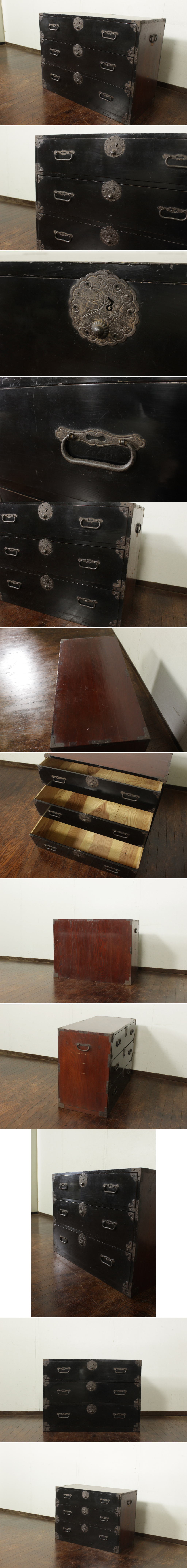 | 商品紹介 | 古い庄内箪笥です。 前面は黒塗り仕上げで、落ち着いた趣のある佇まいが魅力の一品です。 長い年月を経てきたことで生まれた、味わい深い風合いもとても良い雰囲気です。 特徴的な丸型の錠金具や大きな引手金具が印象的で、時代を感じさせる意匠となっています。 三段の引出しを備えており、収納力もあり実用的にお使いいただけます。 和の空間にはもちろん、ローボードやテレビ台、店舗什器やディスプレイとしてもおすすめです。 古いものならではの風合いを楽しんでいただける方におすすめの品です。 |