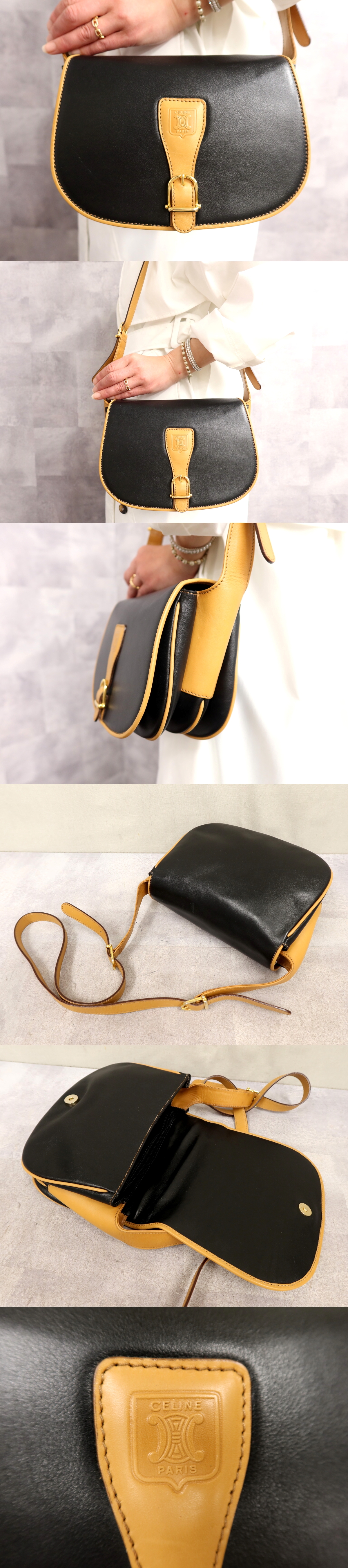 ●超美品●CELINE セリーヌ●フラップ●カーフ レザー 本革●ショルダー バッグ●黒 キャメル●ゴールド金具●斜め掛け●かばん●Js66667 收藏