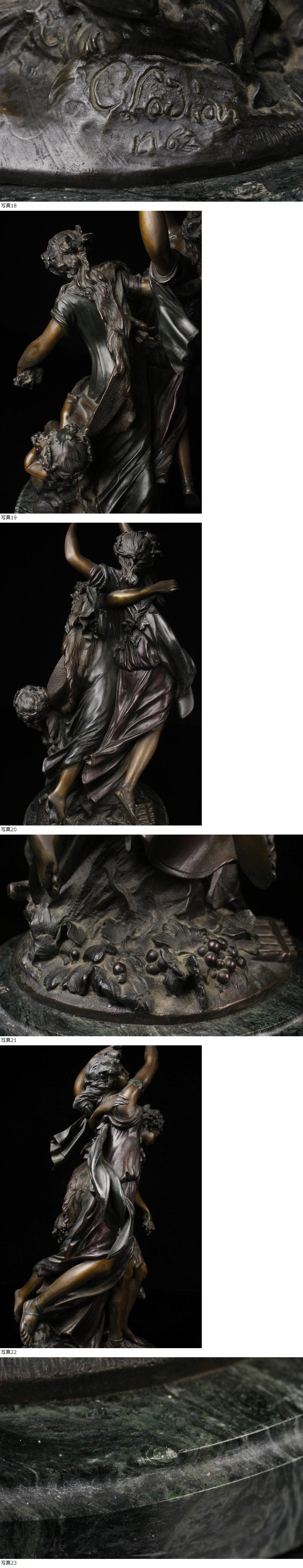 26021904* * * 商品詳細 * * * ここでしか出逢うことのできない唯一の美をご紹介させて頂きます。 フランスの彫刻家 クロード・ミシェル・クロディオンによるブロンズ作品です。 タイトルの「バッカンテ」はギリシャ・ローマ神話の酒神バッカス(ディオニュソス)に仕える 女性の巫女のことをさし、女性の自由の象徴として彫刻や絵画などのモチーフとして好まれました。 華やかに美しく踊る様が精密に表現されており、一瞬を切り取った躍動的な姿印象的です。 葡萄の房が多量に配されており、バッカスの存在を強く想起させます。 経年を経た肌地は深みが増し、しなやかで美しい女性の強さと漲る生命力が感じられる逸品です。 迫力の作品をこの機会に是非お手元にてご堪能下さい。 ■サイズ/横28cm×高60cm×奥行25㎝ 重量18.5kg ■状態/経年による傷み、スレ、キズ、台座に小さな欠けがございます。 ※写真にてご確認、ご了承の上ご入札下さい。 * * * 支払詳細 * * * !かんたん決済 * * * 発送詳細 * * * 入金確認後3営業日以内に発送致します。 ※直接引き取りも可能です。 60~160サイズにつきましては 佐川急便、ゆうパックのどちらかで発送いたします。 ゆうパック発送の場合、弊社の発送日から追跡サービスに問合せ番号が反映されるまで 約1日ほどお時間がかかりますのでご了承下さい。 * * * 注意事項 * * * 運送中の破損があった場合は速やかに当社までご連絡下さい。 保険を利用するのに受取連絡後に運送会社による現場での破損状況確認が必要となります。 勝手に返送されますと保険の適用外となりますのでご注意ください。 * * * * * * お問い合わせ:082-236-8669 |