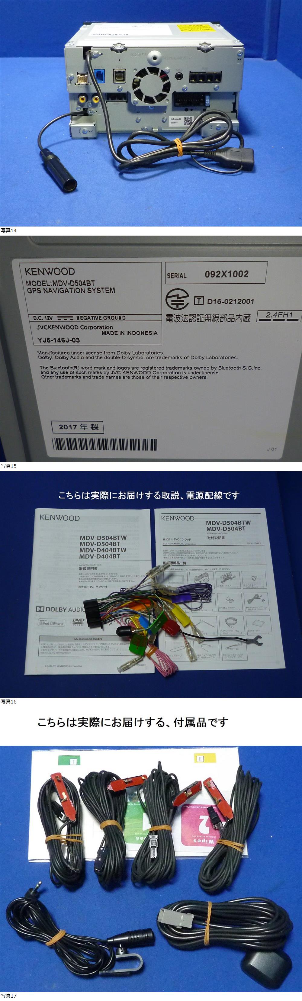 | 商品紹介 | ★★★地図データ最新版に更新済★★★ 地図データ 最新版・2024年春3月リリース版(2023年02版) ファームウェア 最新版(4.7.0009.0100) 開通予定情報 最新版(2025年第4月版) (上記全てこの機種で可能な限りの最新版です) メモリーナビ SDナビ KENWOOD ケンウッド MDV-D504BT シリアルNO.092X1002 2017年製 画面サイズ 7V型 156.6(幅)×81.6(高さ)×176.6(対角)mm 外形寸法 横180mm縦100mm奥行182mm 埋込寸法 横178mm縦100mm奥行159mm モニター部は、 《NEW》光沢パネルを採用した鮮やかな画面を実現 彩り鮮やかでメリハリのある高画質を楽しめる「光沢パネル」を採用。 地図描画が美しく視認性に優れた高画質を実現しています。 7V型の高精細WVGA液晶モニターを搭載。 ホワイトLEDバックライトも備えたことにより、緻密で鮮やかな色彩の映像を実現。 WVGAモニター用に最適化されたマップデザインにより、地図や文字、 アイコンの緻密な表示やリアルな3D表現、明るさが変わる昼・夜どちらの車内でも 見やすい色彩・画面設定を行っている。 <高速レスポンス> 当社独自の高速描画技術「ジェットレスポンスエンジンⅢ」を搭載。 フリック、ドラッグなどスマートフォン感覚のタッチ操作にもすばやく反応します。 「ジェットレスポンスエンジンⅢ」の心臓部には、デュアルコアCPUを搭載。 複数のプロセスを同時並行で処理できるため、ナビゲーションしながら 動画再生といった高い負荷のかかる処理もスムーズにストレスなく行えます。 BluetoothRレシーバー内蔵により、ハンズフリー通話や、ワイヤレス音楽再生が可能 映画DVDはもちろん、地デジ番組録画ディスクも楽しめるDVD再生機能 また、ドライブレコーダーの普及が進んでいることに合わせて、 ケンウッド社製ナビ連動型ドライブレコーダー「DRV-N520」や 同社製リアビューカメラ「CMOS-320/230/230W」の接続を可能とし、 安心・安全運転をサポートします。 取り外すまで問題なく使用出来ていた物になります。 出品に辺り、卓上電源にて下記動作確認・写真撮影しております。 (写真は一部流用してます。電源配線等、形状が異なる場合がございます) 2枚目~6枚目と下記写真はお届けするナビの現物写真です。 ボタン部分の文字剥げ、ほんの少しありますが綺麗な方だと思います♪ 液晶画面、右上隅に傷が有りますが、 何か表示しているとあまり気にならない位かと思います。 タッチパネルズレ、ありません♪ ・ナビ基本操作:OK ・地デジフルセグ/ワンセグTV視聴:OK ・USB、音楽ファイル再生:OK ・iphoneケーブルでUSB接続、iphone音楽ファイル再生:OK ・SDカード、音楽ファイル再生:OK ・DVD再生:OK ・CD再生:OK ・GPS受信:OK ・スピーカーからの音出し:OK ・Bluetooth接続確認:OK ・Bluetooth音楽再生:OK ・マイク接続、ハンズフリー通話確認:OK ・ラジオ受信:OK ・パネル開閉/角度調整:OK ・ユーザー設定の初期化:済み お届けは下記になります。 カーナビ本体、 電源配線(走行中にDVD、TVが見れるような配線加工されてました)、 GPSアンテナ、 フルセグ地デジアンテナコード(両面テープ貼り付け済)×4、 新品フィルムアンテナ×4、 USBコード(本体直付け)、 マイク、 取扱説明書、 取付説明書、 になります。 ※B-CASカードレスタイプです。 問題なくフルセグ視聴出来ております。 本体背面に・・・ リアモニター(市販品)への映像出力、 ドライブレコーダーDRV-N520(別売品)からの映像入力、 車両アンテナからの入力、等が有ります♪ 製品詳細ページ、プレスリリース ←クリックしてご覧頂けます 取扱説明書 ←クリックしてご覧頂けます 取付説明書 ←クリックしてご覧頂けます 比較的綺麗な方だと思いますが、 こちらは中古品になりますので、年相応の使用感や小傷、汚れ等ございます。 出品に辺り写真に写っている動作確認は確認出来ておりますが 短時間での確認となり、その他全ての動作確認を出来ている訳ではございません。 保証は有りませんので、その点ご了承の上、ご入札願います。 また電源配線など、途中でカットしている場合もございますし、 加工している場合もございます。 必要に応じて、取付の際、加工が必要な事もございます。 配線コード関係はビニールテープ等の粘着が残っている場合もございます。 ツメ等もカケが有るかもしれません。 いずれも動作には支障ありませんし、取付業者は手慣れている事だと思います。 配線、コード関係はあくまでおまけとお考え頂き ご理解の上、ご入札願います。 取付方法、ご使用方法によって破損、故障する場合も有りますし、 同商品の一部差し替えによる返品防止の為、 ご返品、ご返金は一切出来かねます。何卒ご理解願います。 万一、運送トラブル等で破損の際は、運送保険にてご対応願います。 ------------------------------------------------- 送料一律1500円 (北海道、沖縄は送料2500円になります) お支払は落札価格+送料になります。 当方お休みを除き14時までにかんたん決済受付確認出来ましたら 即日発送致します。 |