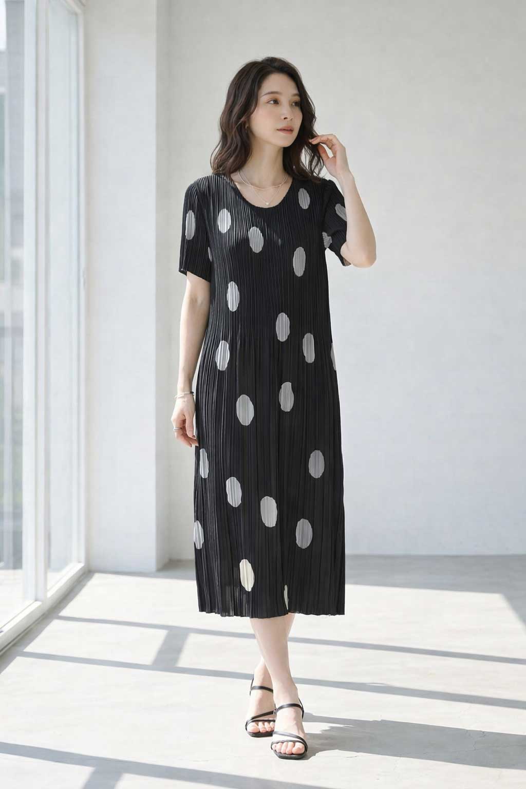 新品 TRUBE ブラック 大ドット柄 総プリーツ ワンピース 半袖 レディース M L ゆったり マキシ丈 ロング 細見え 体型カバー 春 夏 收藏