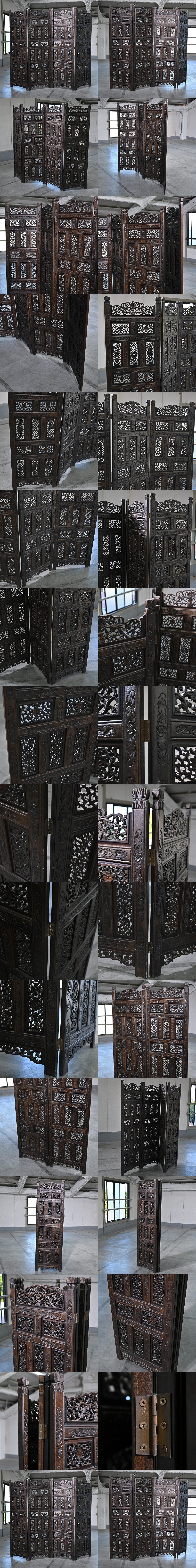 アジアンビンテージ 衝立て 無垢材 木 折りたたみ 彫刻 透かし彫り 花 間仕切り パーテーション 屏風 植物 ついたて_李朝家具 民芸家具 收藏