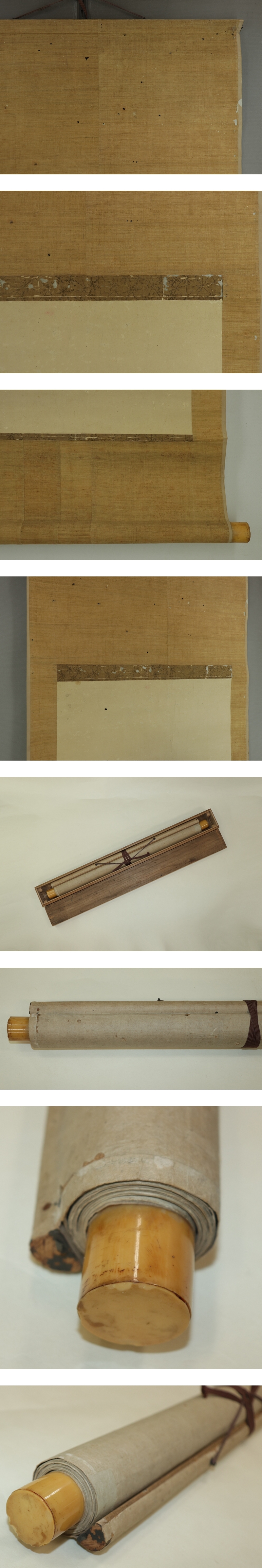 狩野養川院 江戸後期の画家。 木挽町狩野家七世。栄川院典信の長男。 名は惟信、幼名は栄次郎、別号に玄止斎。 画を父に学び、父の歿後その跡をついで幕府の奥絵師となり法印に叙せられる。 文化5年(1808)歿、55才。 本紙は、染み、汚れ、折れ、皺、虫食いがあります。 表装は、染み、汚れ、強い折れ、皺、虫食い、破れ、ほつれ、くすみ、ヤケ、 生地剥れ、軸先に汚れと傷があります。 【サイズ】 作品 横約47.5cm×縦約134cm 表装 横約60cm×縦約189cm |
