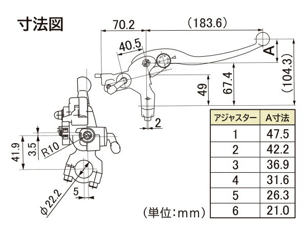 ※ご使用のキャリパーとの組み合わせによっては必要ブレーキ液圧が発生する前にレバーがグリップに当たり使用できないレバーアジャスター位置があります。レバーアジャスターの調整を行ない、ブレーキが十分に効き、なおかつレバーがグリップに接触しないレバーアジャスター位置でご使用ください。
