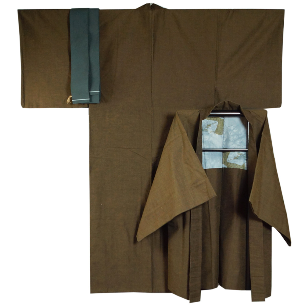 | 品 名 | 男着物 紬 アンサンブル 着物・羽織・綴れ織 角帯 セット 涅色・黒檀色系交ぜ織り無地 Mサイズ 【男着物 中古 紬 正絹 メンズ 着物 メンズ着物 アウトレット 着物 リサイクル着物 男物 】 | ||