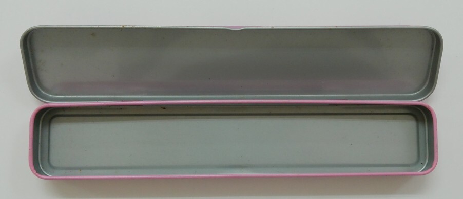 ⑳ 1円から売り切りスタート・・ 缶ペンケース ペンケース 小物入れ 昭和レトロ ピンクxパープル 未使用 j a201h0402