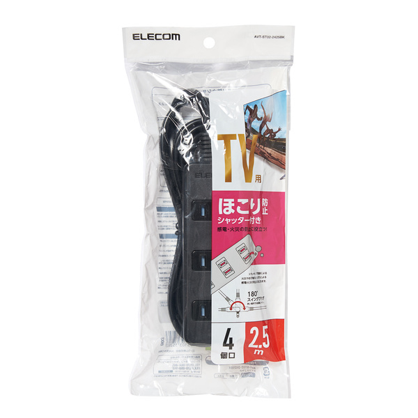 TV用ほこり防止シャッター付タップ 2.5m 4個口タイプ 未使用時にほこりの侵入を防止するほこり防止シャッター装備: AVT-ST02-2425BK 收藏