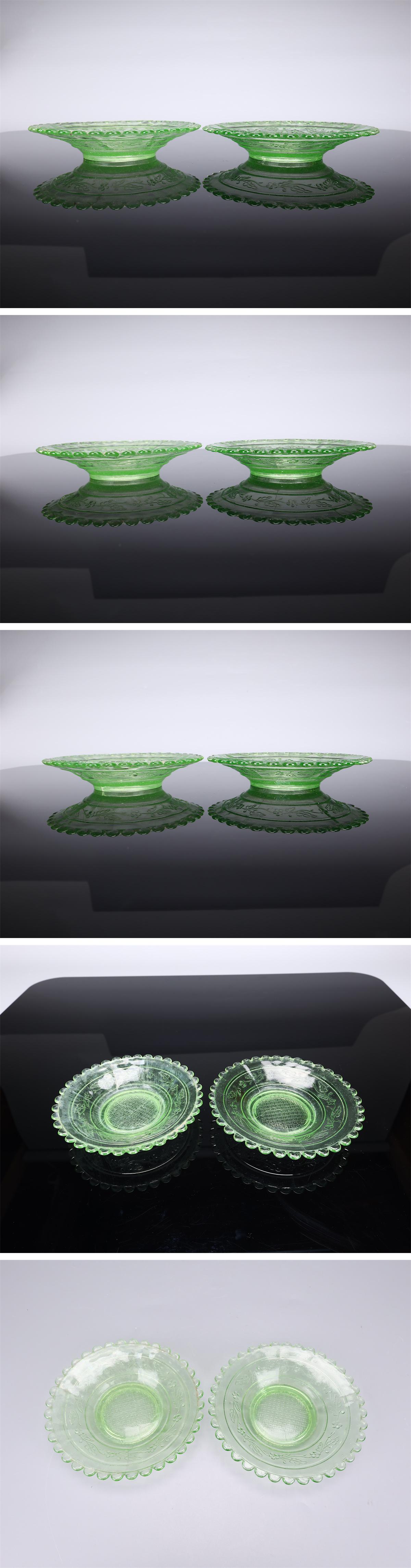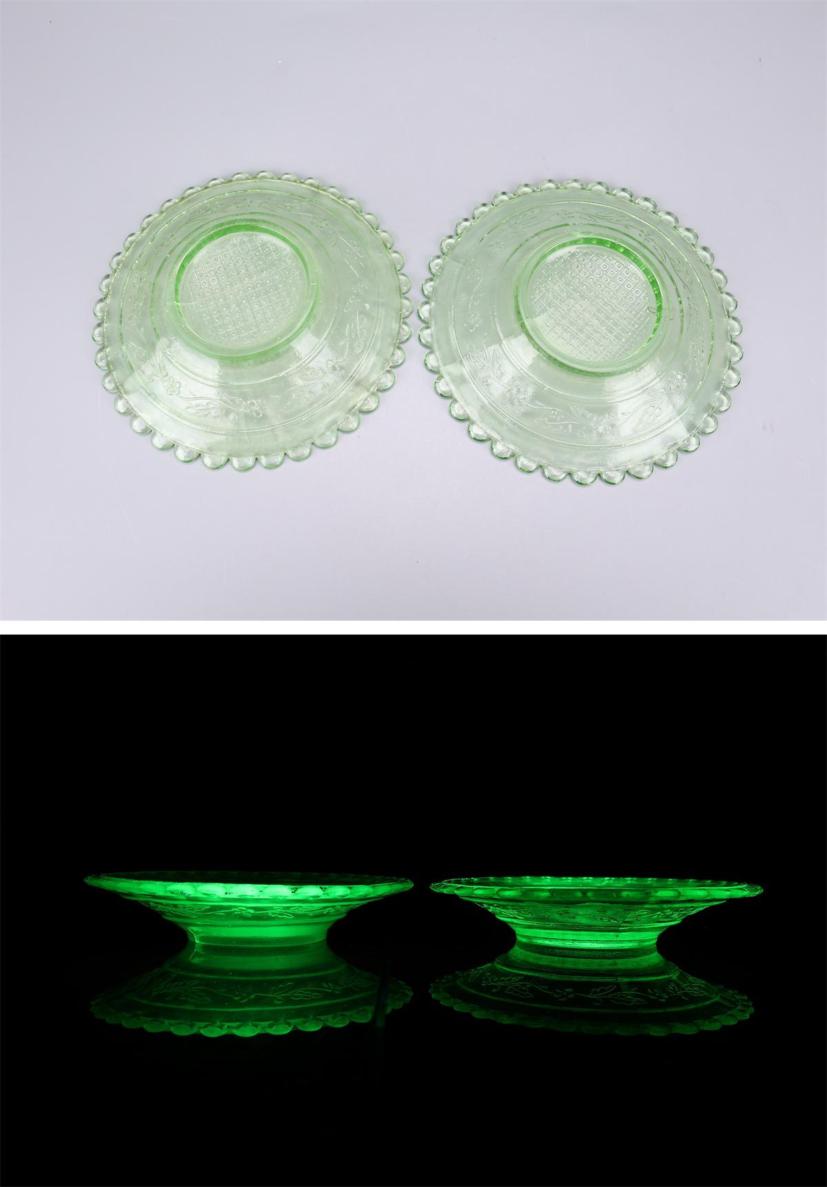 【吉】PC150 明治大正時代 【ウランガラス】 輪花皿 2点 一対 高2.5㎝ 幅13.5㎝/時代の窯傷あり! 收藏