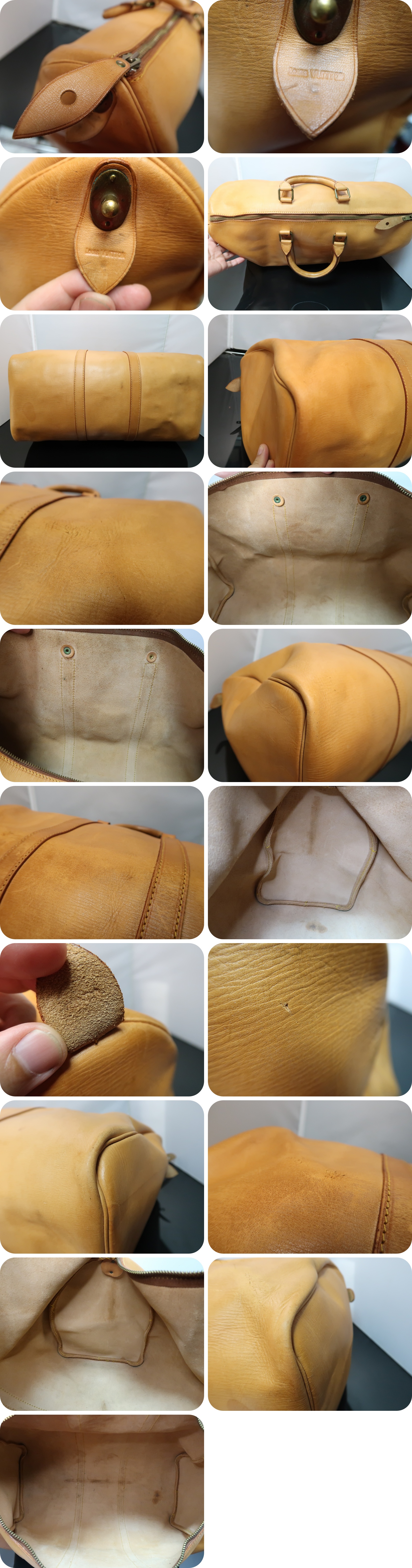 | <外側> | 生地表面に擦れが見られます。 まだ革が柔らかく良品です。 ハンドルのカシメ1か所を私が補修しております。 |