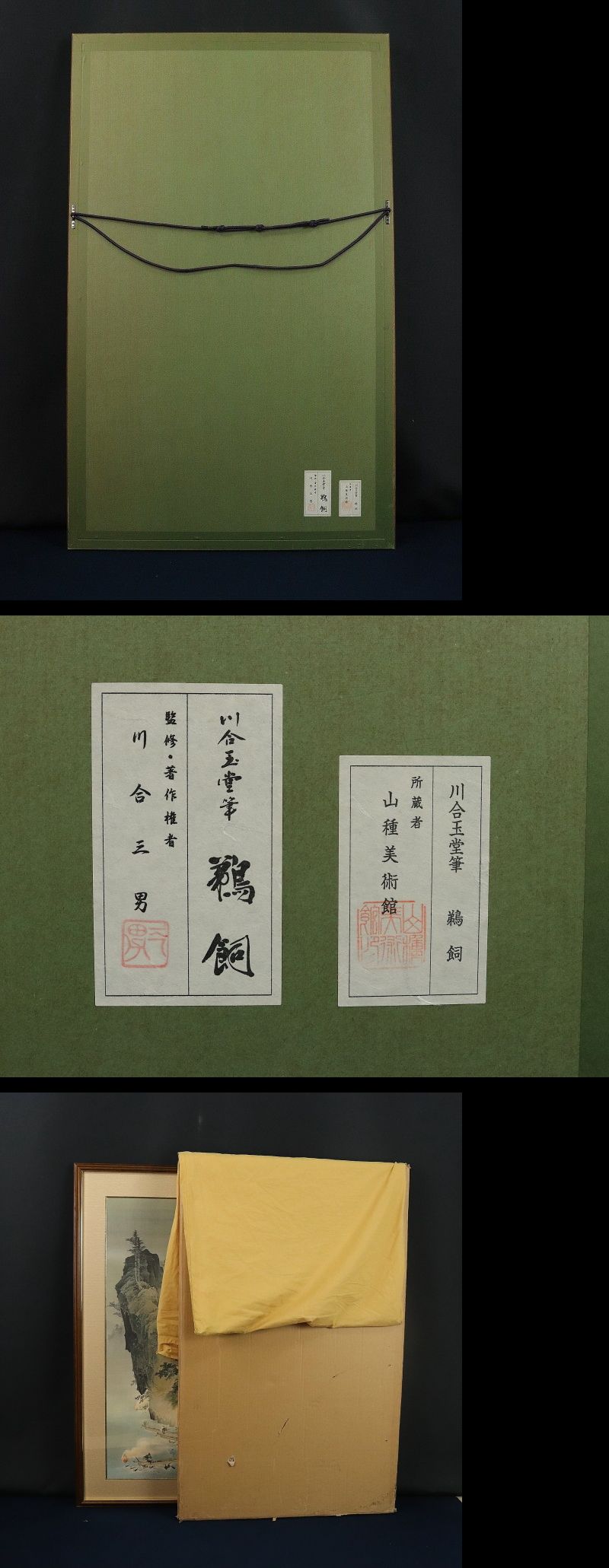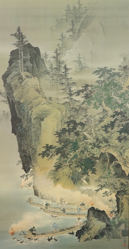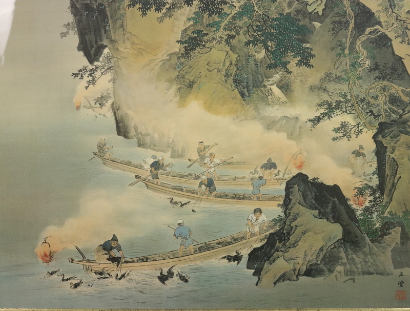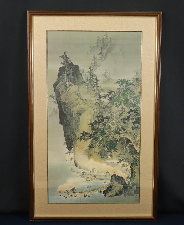 11183■【真作】川合玉堂 「鵜飼」 絹本 工芸印刷 幸野楳嶺師事 愛知の人 額装 收藏