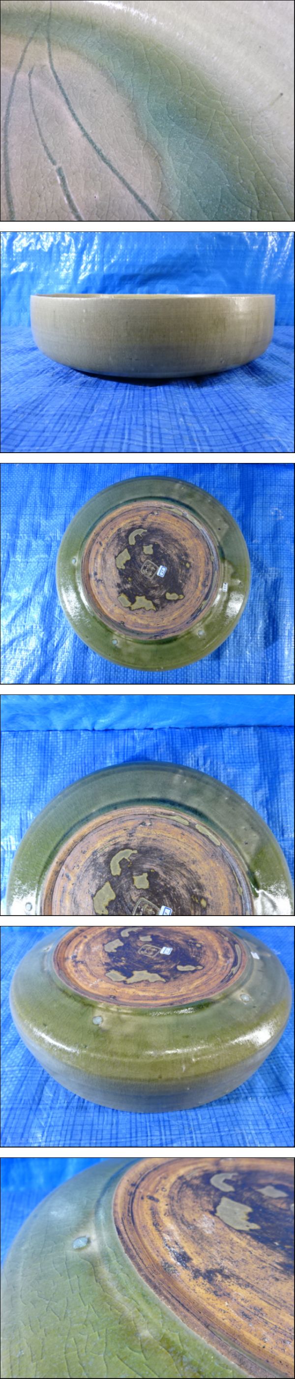 QC-92/青山双男 草の頭窯 美濃焼 灰釉 大鉢 青山双流 多治見市無形文化財保持者 父 青山禮三 水盤 生け花 花器 華道具 茶道具 未使用 收藏