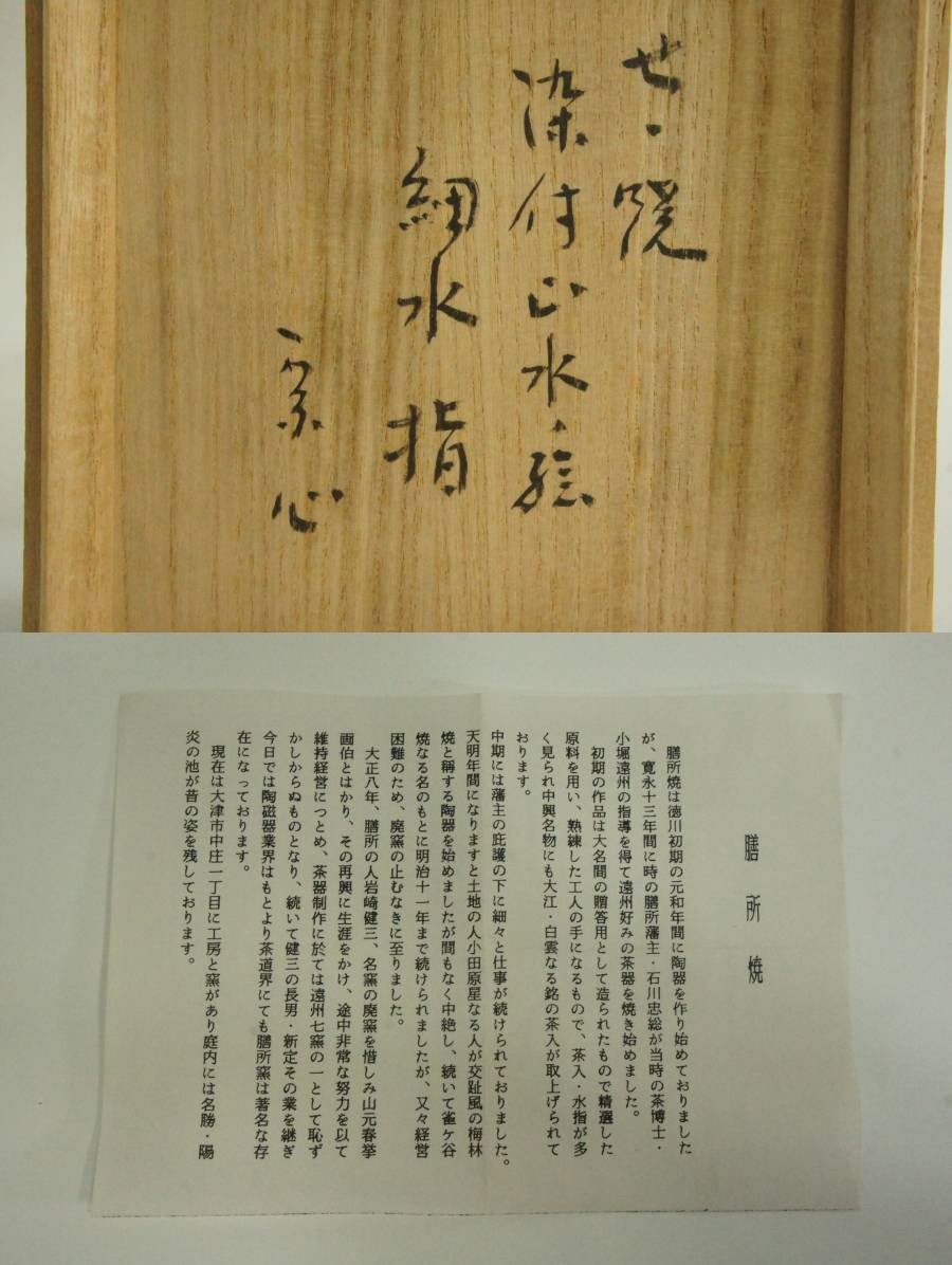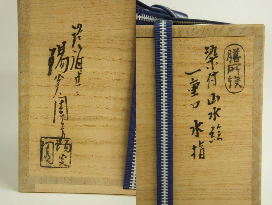 共箱蓋裏に「膳所焼染付山水絵細水指」と書付があり、塗蓋裏に花押があります。