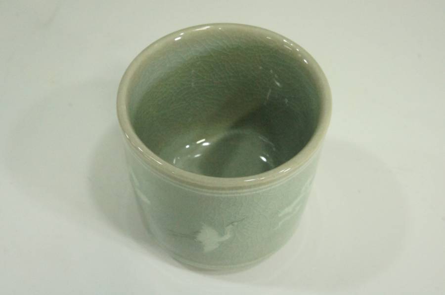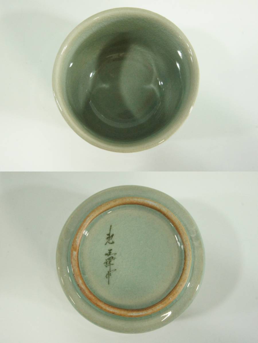 ●韓国陶磁 人間文化財 人間国宝 池順鐸 高麗青瓷雲鶴文湯碗 5客セット 青磁 煎茶碗 状態良好 共箱 茶道具