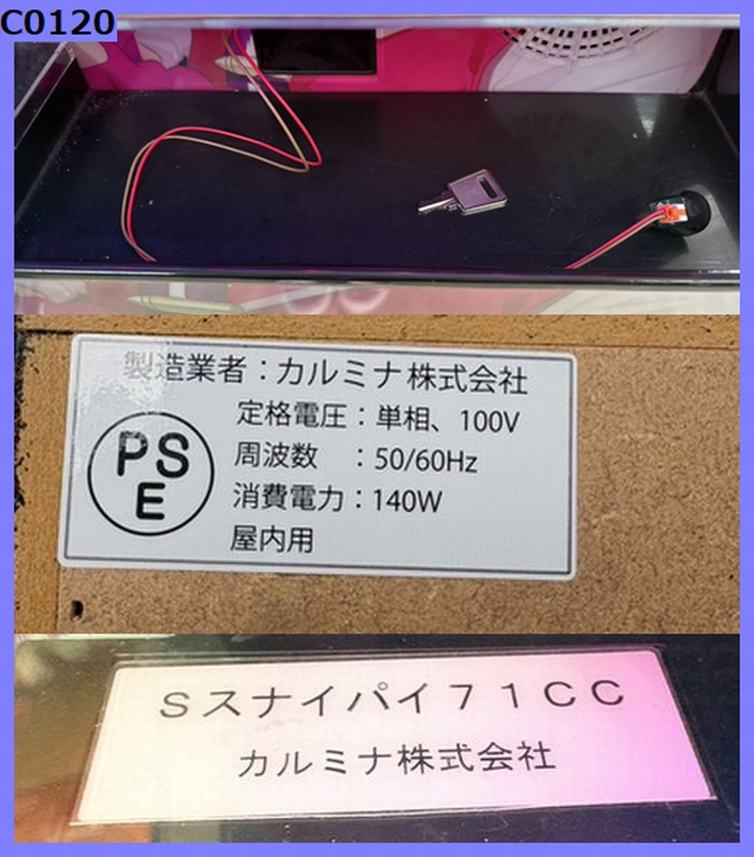 | ■型番・メーカー■ ・Sスナイパイ71CC/カルミナ株式会社 ■電源・年式■ 単相100V ■コメント■ 写真の通りになります。 コイン不要機になります。 設定機鍵×1 本体鍵×1 動作確認済みになります。 ■外形寸法 ■ 幅475 x奥400 x高810 (mm) ■動作確認■ 確認済み ■商品の状態■ 中古商品になります。 | ||