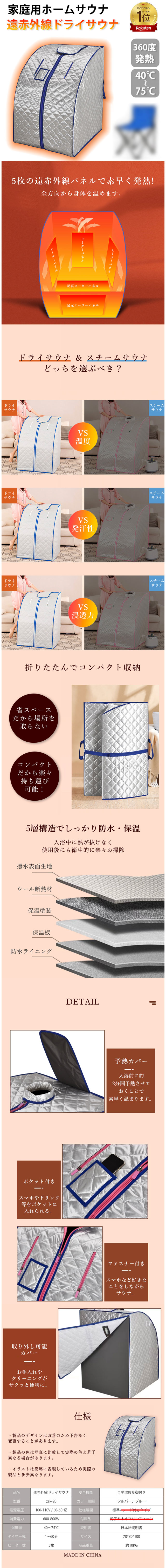 Spero 遠赤外線ホームサウナ zak-20 を出品いたします。 ■特徴■ 従来のサウナと比較して... 人目が気にらず、好きな時、 好きな所で「ととのえる」 テレビやスマホを見ながら、 サウナを更に楽しめる 交通費や、入浴費がかからないからお金の節約に 移動が要らないから時間の節約に 入浴中に水分補給が出来る 5層構造でしっかり防水・保温 入浴中に熱が抜けなく 使用後にも衛生的に楽々お掃除 予熱カバー 入浴前に約2分間予熱させておくことで 素早く温まります。 ポケット付き スマホやドリンク等をポケットに入れられる。 ファスナー付き スマホなど好きなことをしながらサウナ。 ■仕様■
