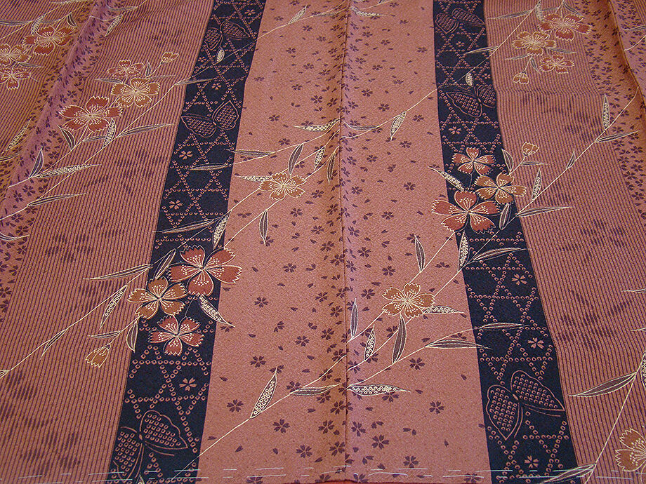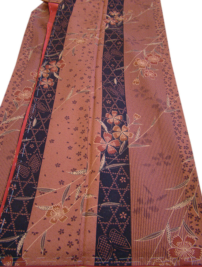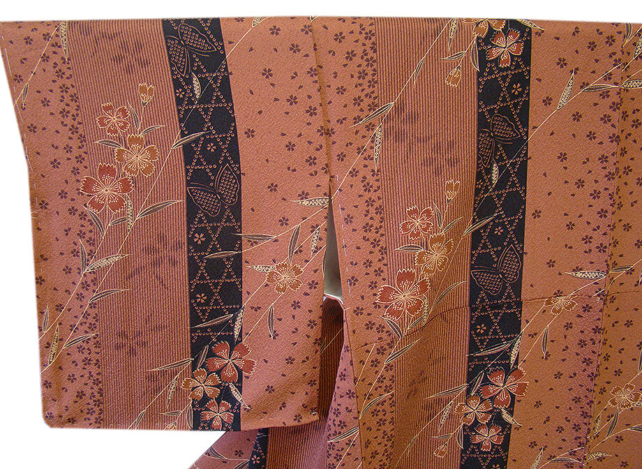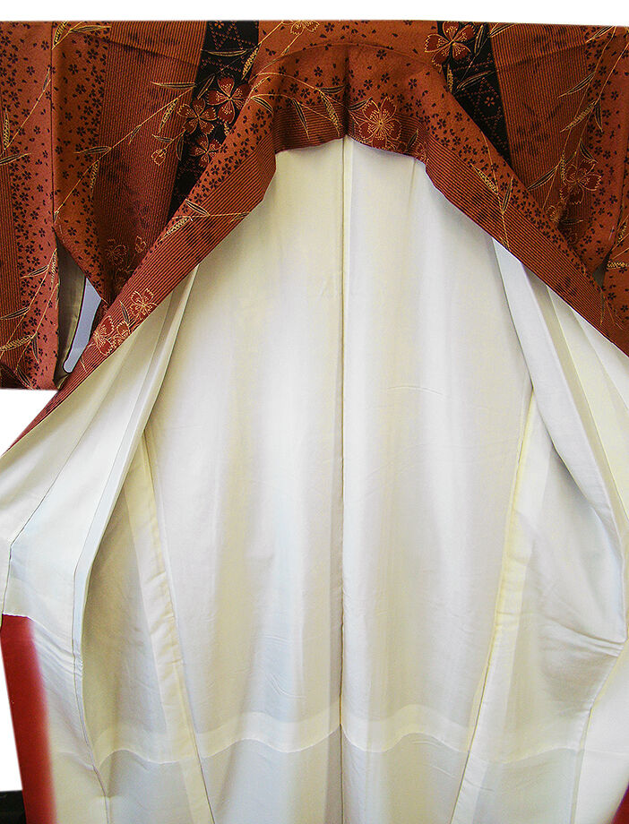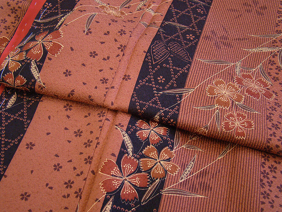 | 商品説明 | こちらのお品は「袷」ですので10月から5月までお召頂ければと思います。 とてもしなやかな手触りの着心地良い重めの滑らかなちりめん地の生地、 渋い小豆色地に黒色のラインに花草、蝶の染柄、 八掛は今様色(正絹)、幅広い年代の方にお召頂けます。 |