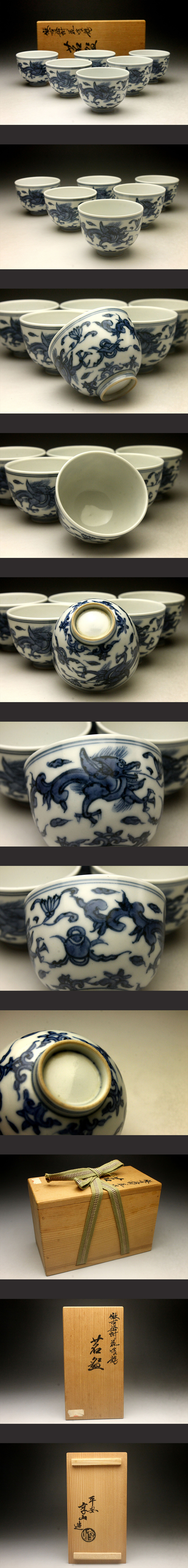 【余韻】 平安享山 倣古染付 花喰龍 茗碗 6客★煎茶道具 共箱 無傷美品<同梱可> 收藏