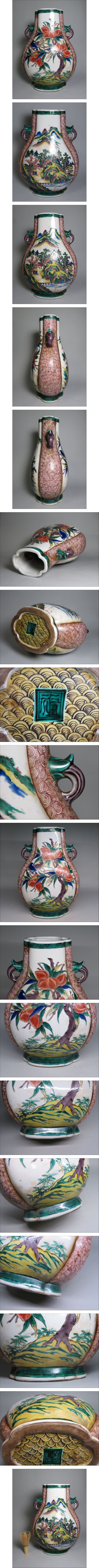 「コレクター所蔵品」◆明治期◆九谷焼 色絵 桃と山水文双耳瓶 高さ31.8㎝ ◆検:伊万里焼/有田焼/鍋島焼lot:110903 收藏