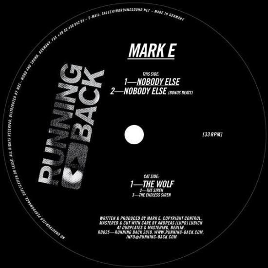 Mark EがRunning Backからの2010年作。パーカッションが印象的なビートに骨太ベースラインが入ってくる屋内でも野外でも違った聴こえ方で威力を発揮しそうな「Nobody Else」に、パーカッションに焦点を当てたコレが使える「Nobody Else (Bonus Beats)」、じわじわと侵食してくる美しい酩酊ミニマル「The Wolfも素晴らしいです。
