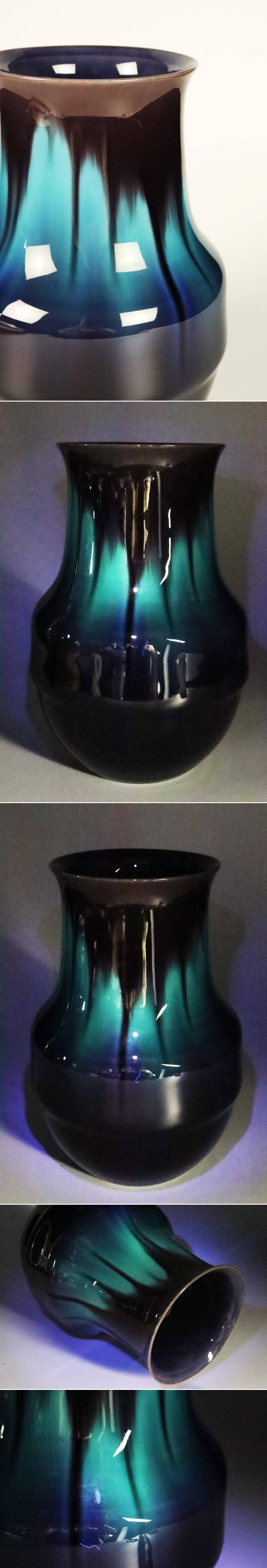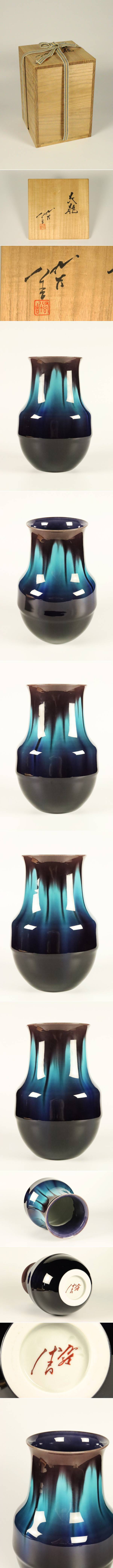 【ASAHI】九谷 徳田正彦(徳田 八十吉) 碧明釉花器 21.5cm 花瓶 壺 共箱 骨董 置物 花瓶 [711133ep] 收藏