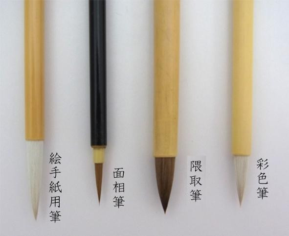 | 素材・材質 | 絵手紙用筆・・・馬毛・狸毛 彩色筆・・・馬毛・羊毛 隈取筆・・・馬毛・羊毛 面相筆・・・イタチ毛 |