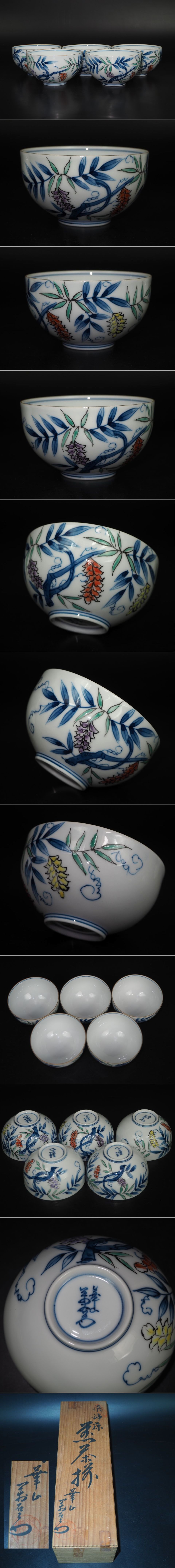 【金富士】有田焼 華山萬右衛門 豆彩 総手描き茶碗5客 未使用 共箱 検/楽山紫砂九谷備前萩焼常滑伊万里骨董宝生雪堂中国古玩骨董 收藏