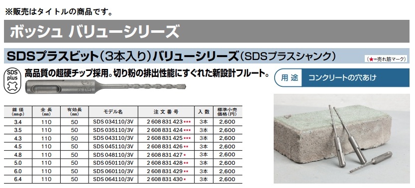 ボッシュ SDS043110/3V SDSプラスビット 3本入 錐径4.3mmφ 有効長50mm 2608831425 バリューシリーズ BOSCH ネコポス可 在庫 收藏