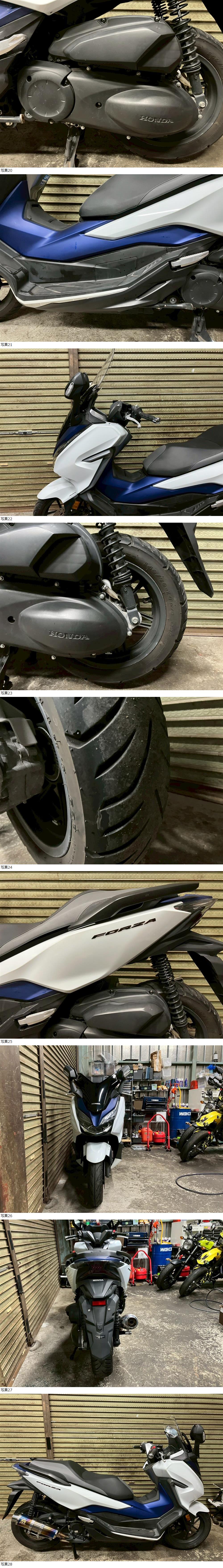| 商品説明 | この度は当出品車両をご覧頂きまして誠に有難う御座います。 他にも複数台出品がございますので宜しければご覧ください! ご入札頂けた際には文末にありますお取引詳細にご同意頂けたものとさせて頂きます。 下記車両詳細・お取引詳細になりますので必ずご一読くださいませ! また、直接お越しいただいた方にその場で販売することもあるため予告なしに出品の取り消し等をする場合も御座います。 よって、落札前には一言コメント欄にてご一報頂けますと幸いです。予めご了承下さい。 〜〜車両詳細〜〜 メーカー:ホンダ 車種:フォルツァ ABS 年式:2018年式 色:青/白 鍵:純正キー2本 排気量:250cc 走行距離:11,525km 燃料供給装置:インジェクション フレームNo:MF13-100**** フォルツァABSのMF13モデルが入荷いたしました! ・外観 ワンオーナー車輛で綺麗に保管されてきた車輛となっております♪ SP忠男マフラーが搭載されており、純正マフラーと違ったサウンドが楽しめます! 純正キーが2本搭載されています☆ ・エンジンセルにて始動O K! 吹け上がり良好! 確認箇所は以下となります。 スピードメーター:作動OK! ヘッドライト:ハイロー点灯! ウィンカー:前後左右点灯! テール:尾灯・ブレーキ共に点灯! ナンバー灯:点灯! ホーン:作動OK! ★別途部品交換受け付けます! ・タイヤ前後交換など!詳細は直接お問い合わせくださいませ! エンジンオイル・タイヤ交換など! 詳細は直接お問い合わせくださいませ! *上記ご利用の際は部品の在庫状況によりお引き渡しまでにお時間を頂戴する場合が御座います。 〜〜お取引詳細〜〜 ※ご注意ください※ 出品車両はあくまで現状販売となります。走行点検などは行っておりません。 良好・好印象などの表記に関しても車両の状態を確実に保証するものではなく 細かい程度の差なども含めあくまで当方の主観でありますこと重々ご承知置き下さい。 特別に気になる箇所など(外観に限ります)がある場合は直接ご相談ください。 ご指定いただきました箇所のお写真を添付をさせていただきます。 (あまりにも多い場合はご対応致しかねます。) 上記を踏まえまして現車の確認は大歓迎です。 細かい箇所など気になる方は是非とも現車確認を行ってください! (予約制となりますので直接お問い合わせください。) 一般の二輪販売店と同様の点検・整備は行っておりません。 車両に関する一切の保証等も御座いませんので自走でのお引き取りはお断り致します。 ある程度の知識があり落札後にご自身で整備の出来る方、或いは整備工場等にて分解整備を別途検討できる方、メンテナンスベースとしての使用などの落札を推奨しております。 明記してあること以外の確認はしておらず、また致しかねます。 目視できる消耗品以外のパーツに関しましても寿命のわからぬものなど御座います。 (中古品ですのでつい先程まで正常に作動していたにも関わらずお受け取りの際に状態の変化などある場合も十分御座います。例・電子機器、ワイヤー類など) 再三にはなりますが如何なる場合もお引き渡し後のキャンセル・クレームはお受け致しかねます。 現状販売というものを重々ご理解の上ノークレーム・ノーリターンでよろしくお願い致します。 原則キャンセルはお受け致しかねますが、止むを得ず落札者様都合でキャンセルされる場合には 落札金額の1割をキャンセル費用として頂戴させて頂きます。 上記取引内容に不安を感じられる方には二輪販売店等の整備・保証付き車両のご購入を強くお勧め致します。 ★直接引き取り・即引き取り大歓迎! 直接引き取りの場合、落札から1週間以内にお引き取り下さい。 それ以降日割りにて2,200円を別途頂戴させて頂きます。 *部品交換をご依頼の方は完成のご連絡から1週間以内となります。 ★配送OK! 主に配送業者に委託しております。ご自身で手配いただいても結構です。 レッドラインの金額を参考にしておりますのでお手数ですが費用に関しましては落札者様にて直接HPでご確認下さい。 発送元は埼玉県川口市となります。ご購入から配送までの目安は関東近郊で1〜2週間程度となるかと思います。(地域、期間により大幅に異なりますので納期が気になる方は直接レッドラインへお問い合わせ下さい。) 関東近郊の場合割増でお早めにお届けできる場合も御座いますので一度ご相談下さいませ!(対象外となる場合も御座います。) また、配送の場合もお取置き等の対応は致しかねますので落札後は速やかに配送依頼の手続きを行わせて頂きます。 ★車両のみの販売となりますので必要な場合のみ別途5,500円にて販売証明書の発行・発送を受け賜ります! ★新規アカウントの方、落札者様の評価内容によりましては、ご入札頂いても当方の判断で削除する場合がございます。予めご了承下さい。 ★落札後、24時間以内にお客様情報のご入力・落札代金のお支払いがいただけない方のお取引はキャンセルとさせていただきます。(お支払いに関しましては、どうしてもの場