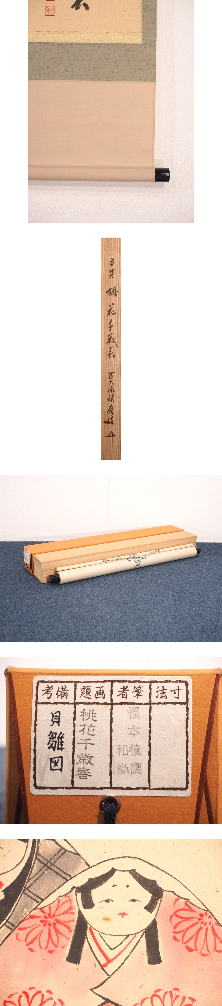 【真筆】【渡鹿庵】[福本積応] 21554 掛軸 日本画 書 「貝雛図 桃花千歳春」 共箱 紙本 臨済宗 大徳寺 在銘 收藏