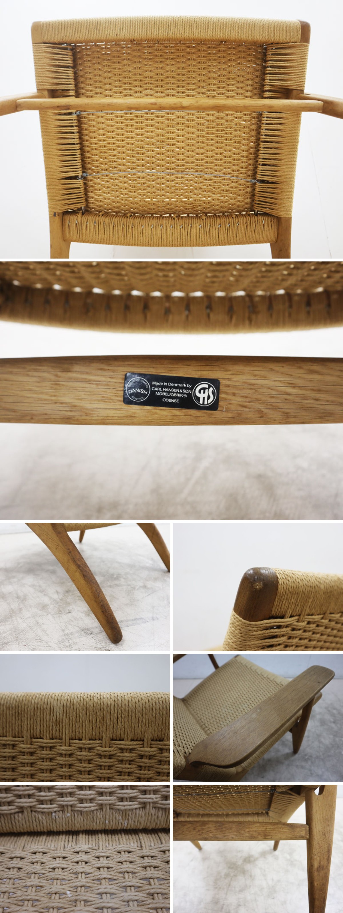 傷、汚れがございますので画像にてご確認下さい。また、ペーパーコードの劣化、正面向かって左側の前脚にぐらつきがございますが、使用には問題ございません。倉庫での保管臭は御座いますがヴィンテージの風合いとしてお楽しみください。