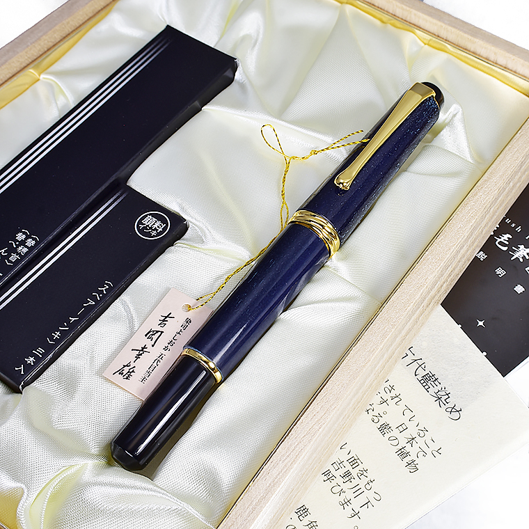 | 【呉竹/KURETAKE】万年毛筆 夢銀河シリーズ 鹿角 古代藍染め 穂先に本毛イタチ毛を使用 DAY140-34 ![]() 墨もすずりも筆も使わずに筆文字が書ける画期的な筆記具「筆ペン」 日本で初めて開発したのは、奈良で墨の製造・販売をしていた株式会社呉竹です。 呉竹は筆ペン第一号の販売に成功した後も苦心の開発と改良を重ね、 現在も筆ペンのトップメーカーです。 ![]() 今回ご紹介する万年毛筆は、万年筆のようにスペアインキ(カートリッジ)式を 採用しているので、気軽に毛筆を味わえる優れもの。 その中から、素材にこだわって作られた高級万年毛筆『夢銀河』シリーズより、 軸に鹿の角を使用し、吉岡幸雄氏の手で藍に染められたモデルをご紹介します。 ![]() 軸は、植物染めによる日本の伝統色の再現に取り組んでいる「染司よしおか」五代目当主、 吉岡幸雄氏の手により、古代の染色技法で染められた鹿角を使用。 中国では藍は「青を染める草なり」と記されていることから、藍は染色の材料を指していると いえます。一方日本では、蓼藍(たであい)の葉で染められた色、また染料となる藍の植物 そのものの両方の意味で使われています。 蓼藍は水分の多い土地を好み、水害にも強い面をもっているため、暴れ川として有名な 徳島県吉野川下流一体で多く生育しています。この藍を阿波藍と呼びます。 今回、この阿波藍を使って鹿角を藍色に染めていただきました。 ![]() ![]() 穂先には鼬毛(いたちの毛)を使用しているので、 トメ・ハネ・ハライと 毛筆独特の本格的な味わいを楽しんでいただけます。 熟練した筆匠が手作業で一本一本丹念に仕上げた逸品。手作り品ならではの良さがあります。 手軽に味のある文字が書けるので御祝儀袋や名簿など、フォーマルな場面はもちろんのこと、 最近では書くことも少なくなった手紙や、日記、写経など幅広い用途にお使いいただけます。 使うほどに手になじみ、細部にわたるこだわりが書く喜びを満たしてくれます。 ![]() 毛筆の「替穂首」に加えて、ペン字タッチの手軽さで細く美しい和文字が表現できる 用途に合わせて付け替えられる「替ペン先硬筆」をセットにいたしました! 替穂首、替ペン先、スペアインキ3本をセットに専用木箱ケースでお届けします。 ※ご購入時の穂首は細字タイプで、硬筆タイプにも交換できます。 ![]() *************************************************************** ≪商品詳細≫ 呉竹 万年毛筆 夢銀河 鹿角 古代藍染め DAY140-34 穂先 : いたち毛(本毛) 機構 : インク交換:スペアーインキ / キャップ式 材質 : 鹿の角 / 古代藍染め 長さ : 137mm 太さ : 15mm 重さ : 22g 付属品 : 桐化粧箱(152×37×207mm) 替穂首、替ぺん先硬筆、スペアーインキ(3本) 定価 : 55,000円(税込60,500円) 新品未使用 日本製 ※天然の鹿角を使用しているため、柄模様には個体差がございます。 またヒビに見える線のような模様や、角本来の凹みなどもございますが、 不良ではなく、この商品の特性となります。予めご了承願います。 ※モニターの環境により、画像と実物の色合いが若干異なる場合が ございます。予めご理解・ご了承の上、ご購入お願い致します。 *************************************************************** |