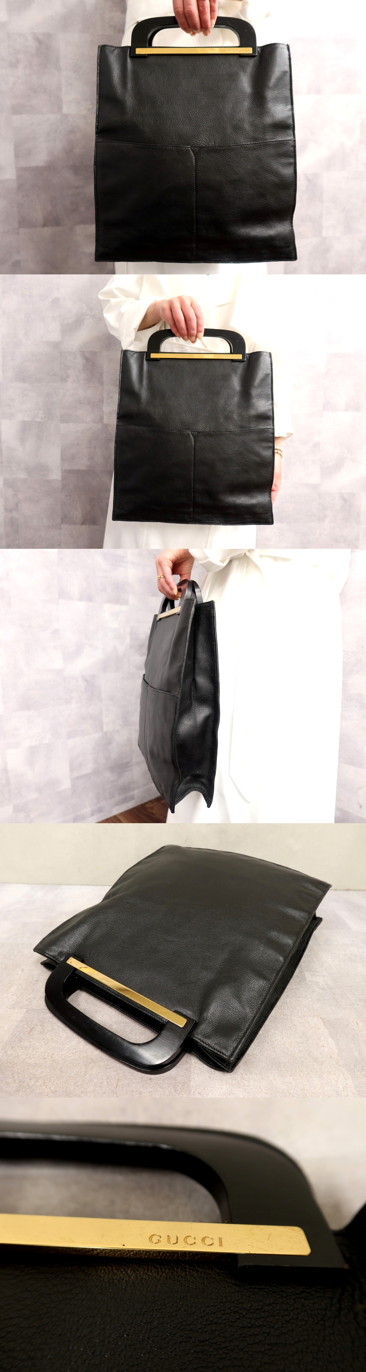 ●超美品●GUCCI グッチ●ウッドハンドル●カーフ レザー 本革●ハンド バッグ●黒●ゴールド金具●イタリア製●ヴィンテージ●A4●Js66685 收藏