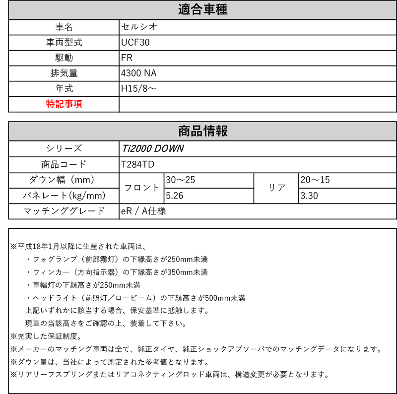 [RS-R_Ti2000 DOWN]UCF30 セルシオ_eR / A仕様(2WD_4300 NA_H15/8~)用車検対応ダウンサス[T284TD] 收藏