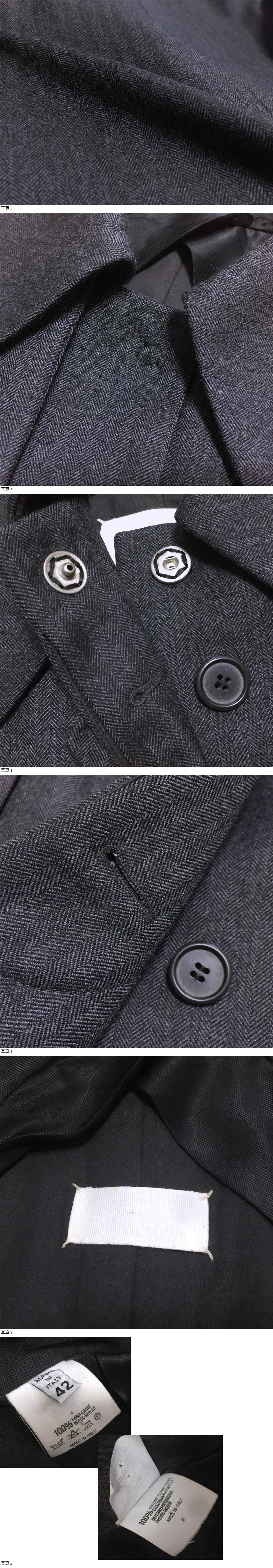| 【ブランド】 Martin Margiela マルタン・マルジェラ 【デザイン・モデル】 90s 初期 白タグ ヘリンボーン ウール 比翼 バルマカーン コート 【生産】 イタリア製 【詳細・コメント】 Martin Margiela マルタン・マルジェラ ヘリンボーン コートになります。90年代中期頃・白タグの稀少な逸品。大きな襟が特徴的な存在感のある仕上がりです。生地はヘリンボーン織り上質ウール地を使用、フロントはスッキリとした比翼仕立て、首元にはチンストラップ付です。男性でも着用できるサイズ感です(当時はメンズラインが無くレディースの大き目サイズを着用していました)。。 27・28年位前に神戸のセレクトショップ・マックスウェルにて購入。当時より、マルジェラのヴィンテージ(過去作品)を取り扱っていました。殆ど着ることなくクローゼットに保管しており、商品状態も非常に良好。非常に入手困難な一着で、今後、この状態のものが出ることは、まず無いかと思います。この機会にぜひ。 正規品です。 【サイズ】 表記: 42 ※実寸を参考にして下さい。 平置実寸:身幅52㎝ 着丈96cm 肩幅41㎝ 袖丈64㎝ ※多少の誤差はご了承ください。 【カラー・パターン】 チャコール グレー系 ヘリンボーン織柄 ※ご覧になられるモニターや、デジカメの撮影具合によって色味が異なる場合がございますのであらかじめご了承ください。 【品質】 表地:ウール100% 裏地:(身頃)コットン100% (袖)キュプラ系 【コンディション】 USED 中古品 です。使用感少なくきれいです。まだまだ着ていただけます!※写真参考に判断して下さい。ユーズドアイテムにご理解ある方のみご入札お願い致します 。 | |||