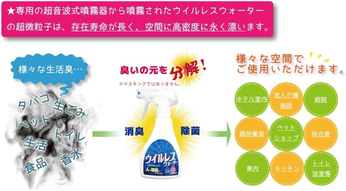 専用噴霧器を使用して空間噴霧する事で、飛沫経路の除菌、消臭効果により洗われた様な空気に変わります。