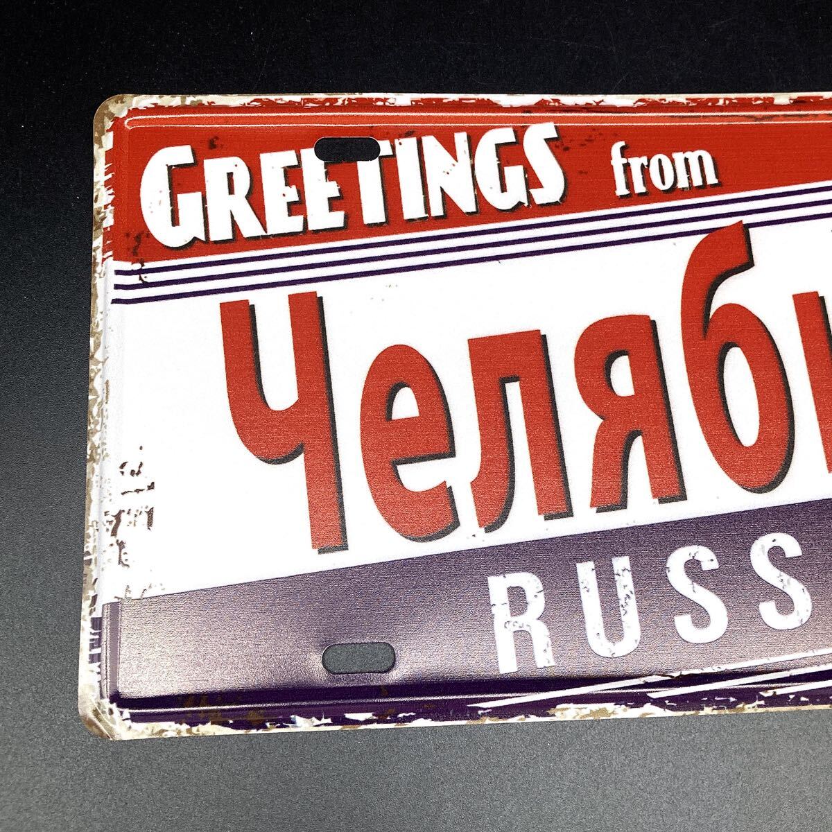 ロシアの都市「Челябинск(チェリャビンスク)」をモチーフにした、ヴィンテージ風デザインのメタル看板。
