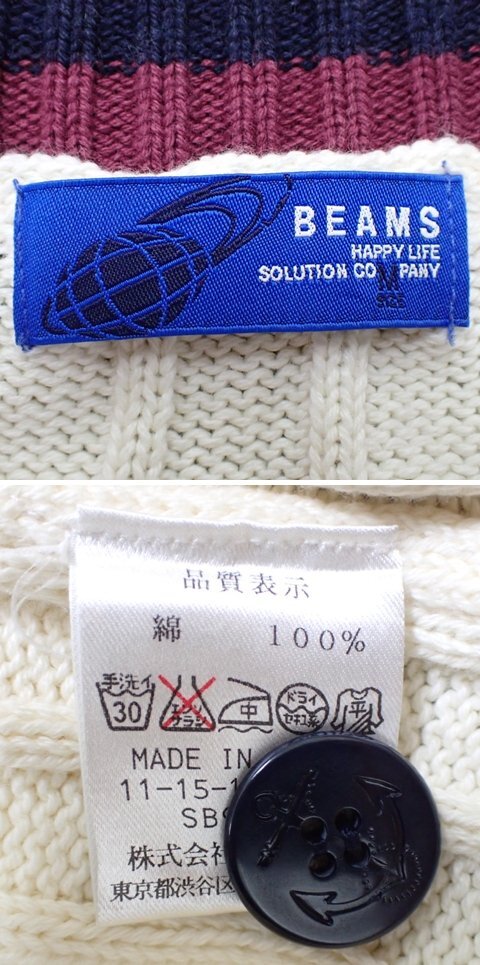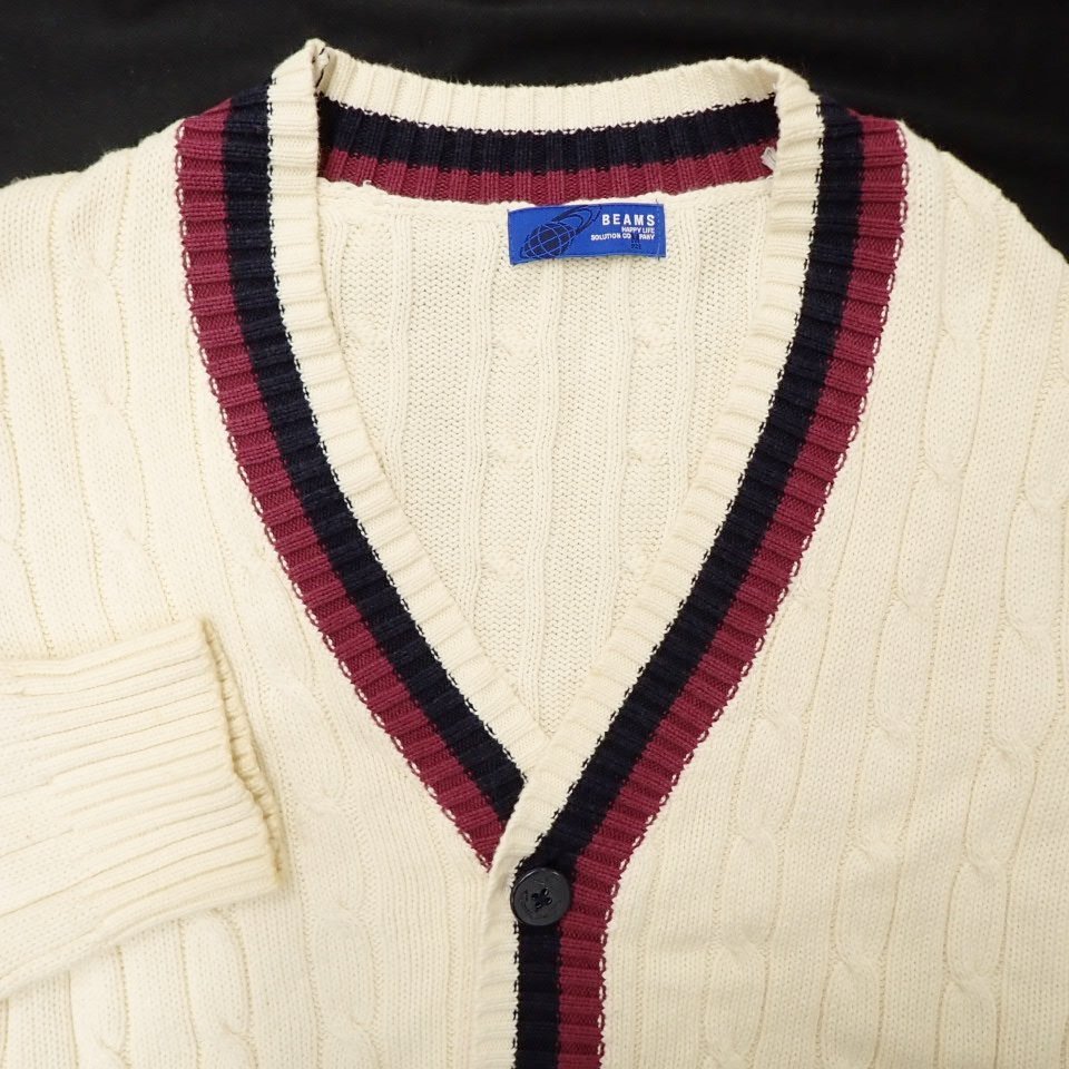 ★BEAMS/ビームス Vネック ケーブルニットカーディガン メンズM/オフホワイト×ブラック×エンジ/コットン100%&2131300091 收藏
